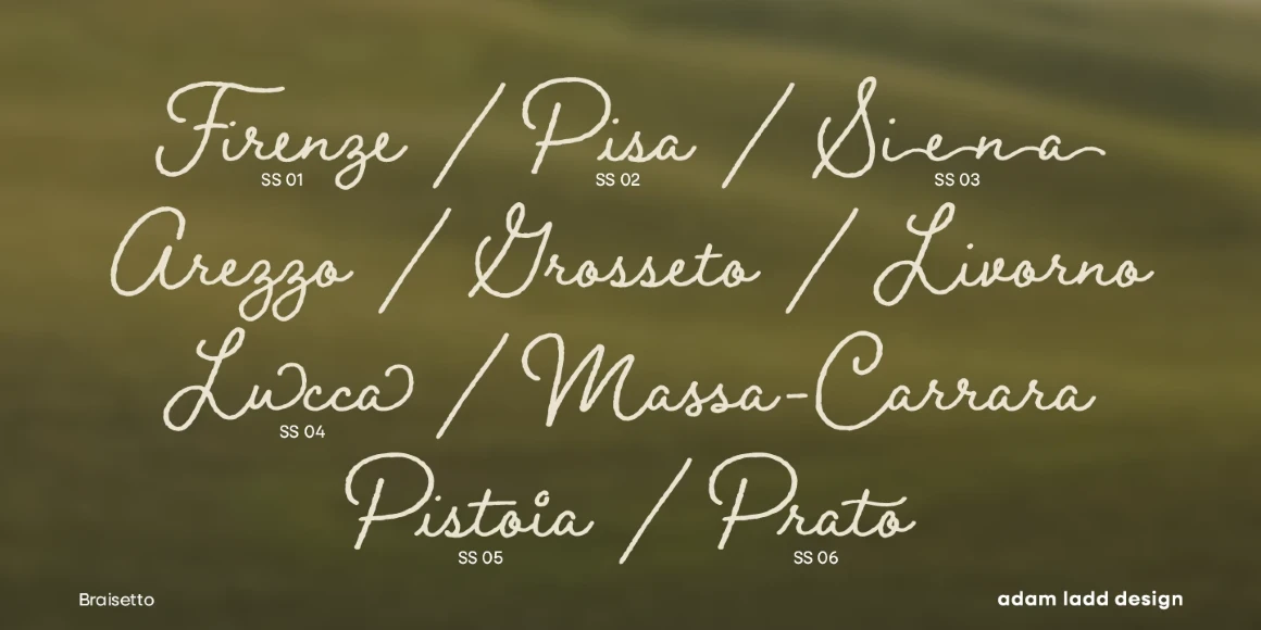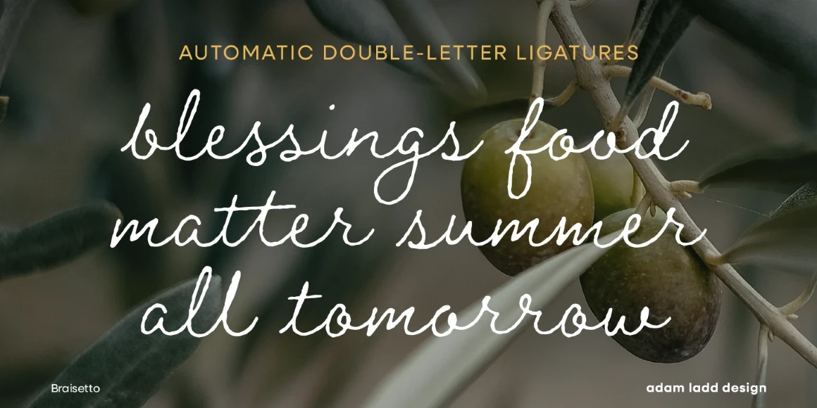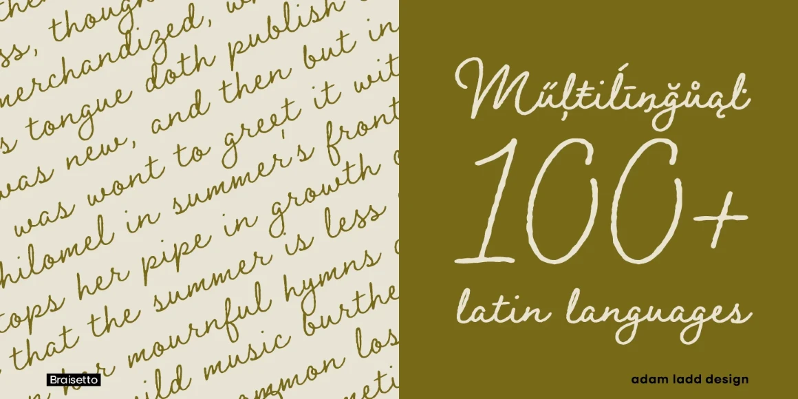 Braisetto is a jovial script typeface designed with a handwritten exuberance. Inky and readable, expressive and functional, this family of typefaces is thoughtfully designed to be both individual and versatile at the same time. Braisetto can stand out as a friendly headline or step back and be a demure complement to pair with other typefaces. Choose from any of the five subtle weights to meet your needs. Braisetto is ideal for branding, packaging, display, products, cards, and more.