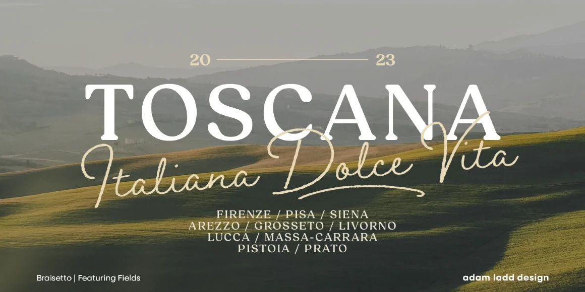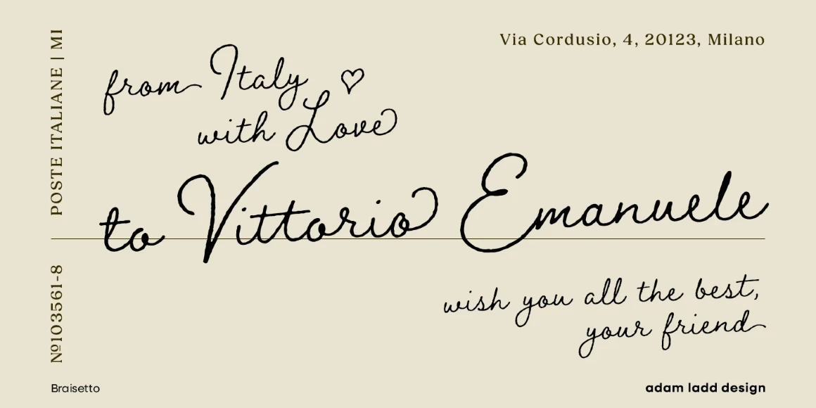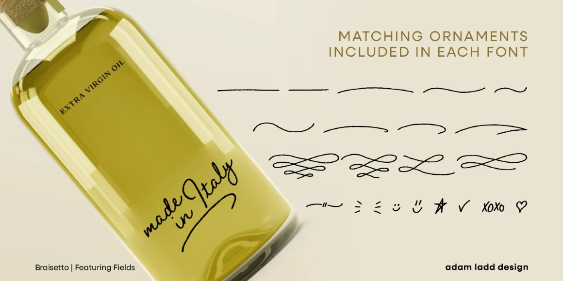 Braisetto is a jovial script typeface designed with a handwritten exuberance. Inky and readable, expressive and functional, this family of typefaces is thoughtfully designed to be both individual and versatile at the same time. Braisetto can stand out as a friendly headline or step back and be a demure complement to pair with other typefaces. Choose from any of the five subtle weights to meet your needs. Braisetto is ideal for branding, packaging, display, products, cards, and more.