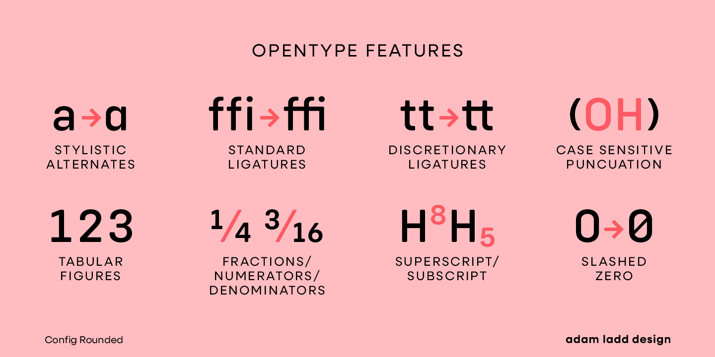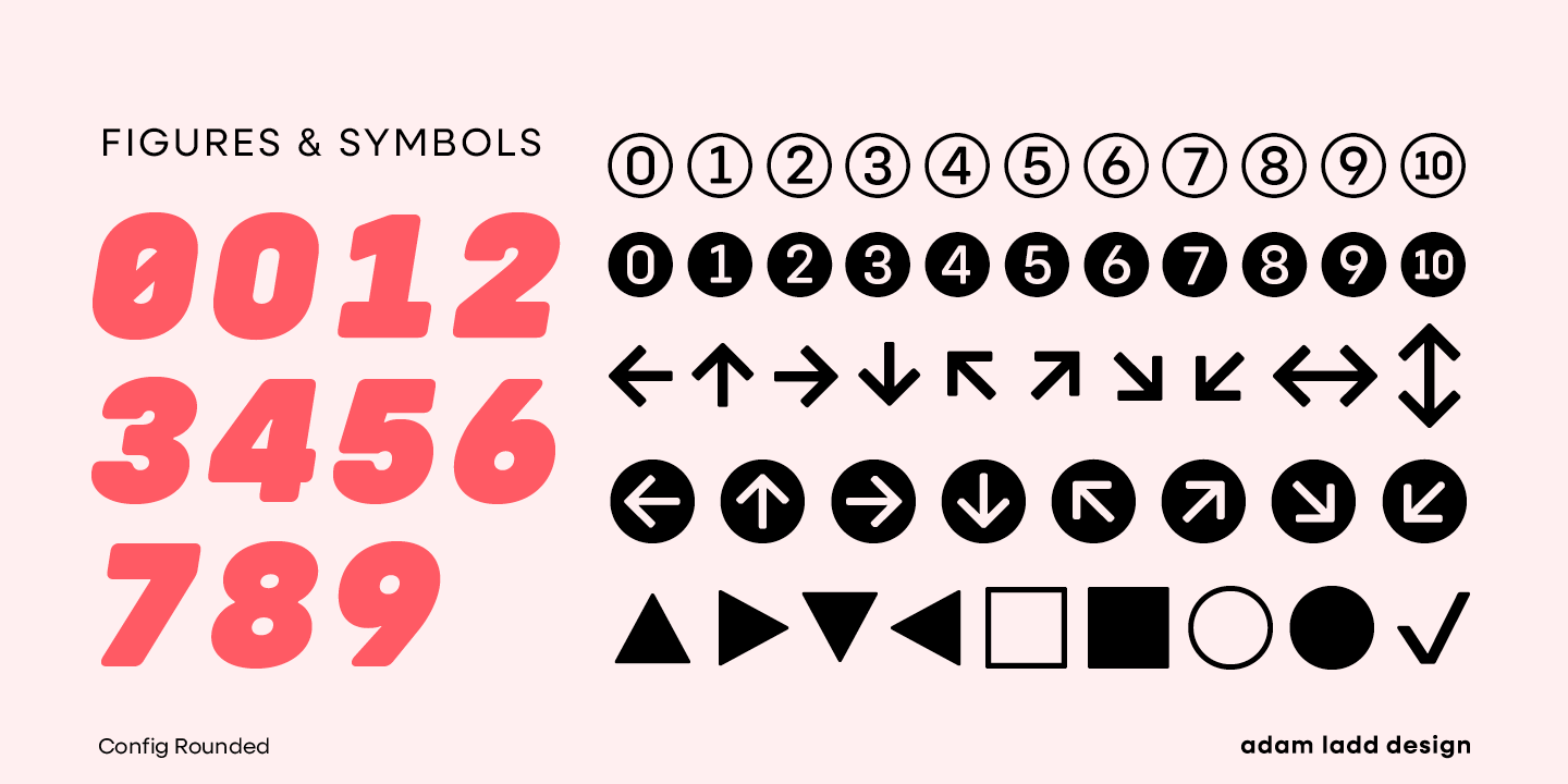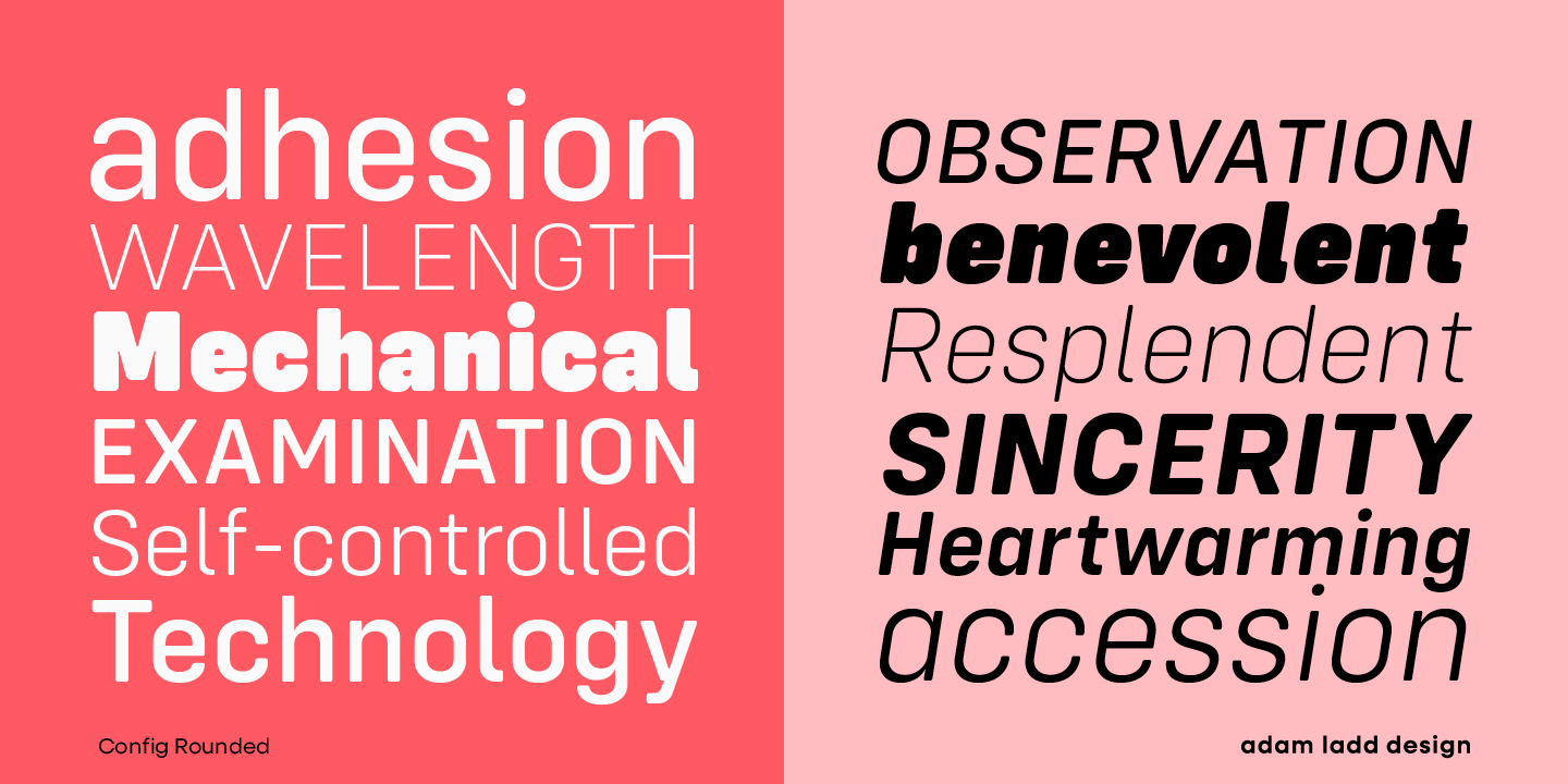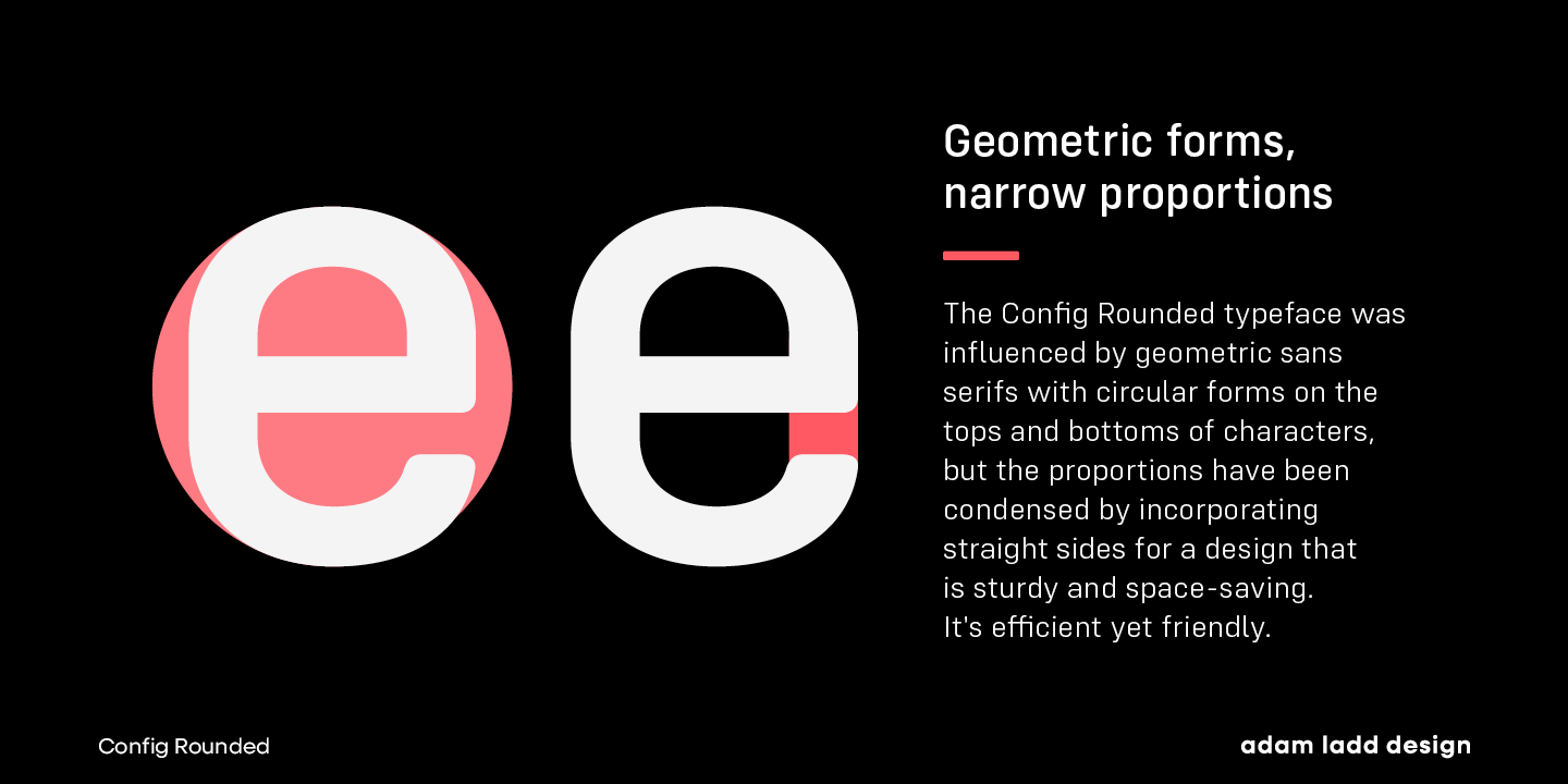 Config Rounded is a soft geometric sans family in the style of other industrial typefaces. With circular forms on the tops and bottoms of characters, the proportions have been condensed by incorporating straight sides for a sturdy, space-saving design. Use Config Rounded for a subtle warmth that still looks modern and strong. This typeface’s efficiently neutral, friendly design and subtle details make it functional for text and display sizes. The options are endless, with 40 styles across 10 weights, plus italics.
