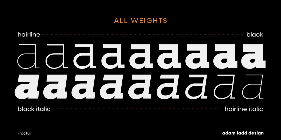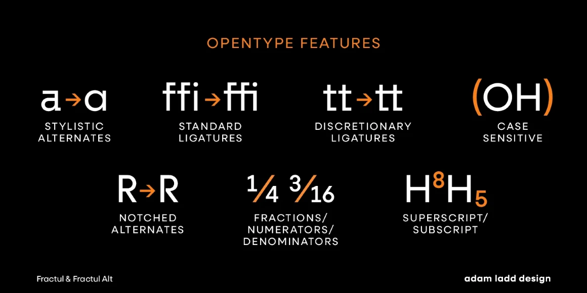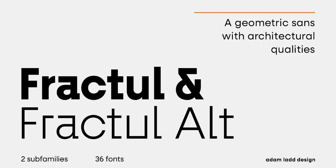 Fractul and Fractul Alt are architectural geometric sans serifs. Dramatically modern because of a larger x-height with a more distinct and avant-garde voice — most evident in characters where specific strokes have been straightened for a strong angular appearance. Fractul has over 600 glyphs and many OpenType features: 6 stylistic sets, standard and discretionary ligatures, case-sensitive punctuation, fractions, numerators, denominators, superscript, subscript, and even a slashed zero.