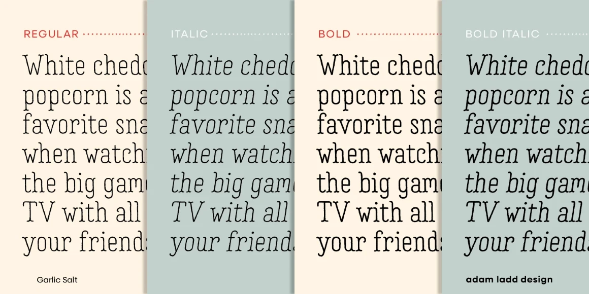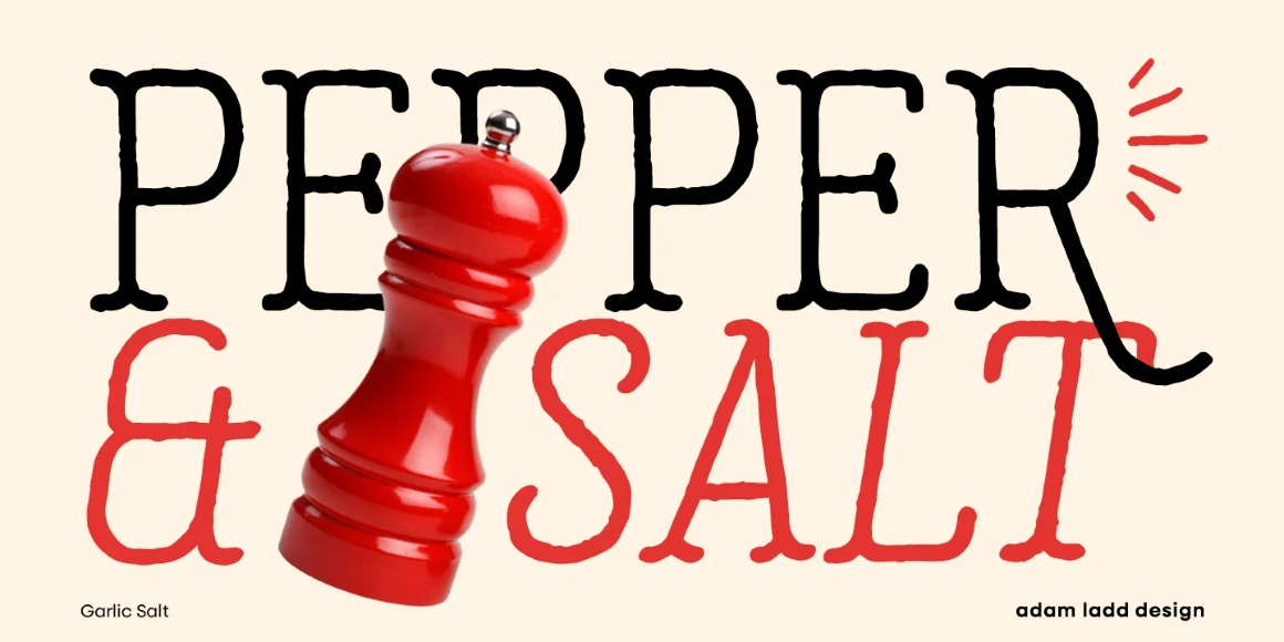 Garlic Salt is a flavorful, hand-drawn, serif font family with a distinctly monolinear mix of whimsical and modern. While semi-condensed proportions are space-saving for your designs, the large x-height and open counter forms mean it works well set large or small. Show off the texture at display sizes or use it smaller, and it remains pleasantly readable because of the carefully shaped letterforms. Garlic Salt also has an Extras font of matching ornaments and dingbats to complement your designs!