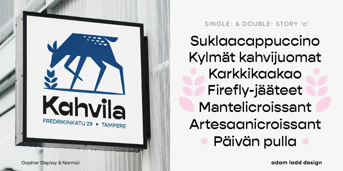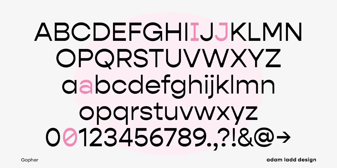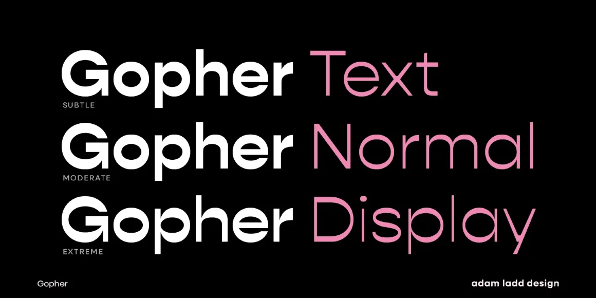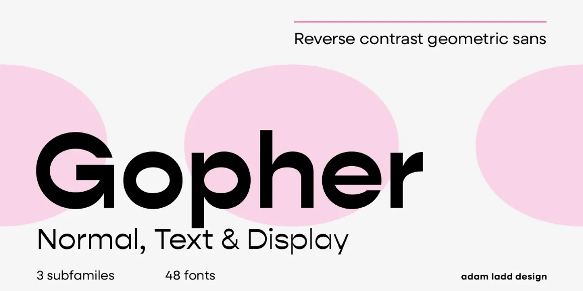 Gopher, Gopher Text, and Gopher Display comprise the families in this modernly quirky take on the reverse contrast, geometric sans. A variation in the amount of contrast distinguishes the three separate families while allowing them to work in harmony together. A generous range of dramatic affect adds to the versatility with Text having the most minor contrast and Display the most for immediate visual impact. The 48 included styles in the complete family range from hairline to heavy and italics.