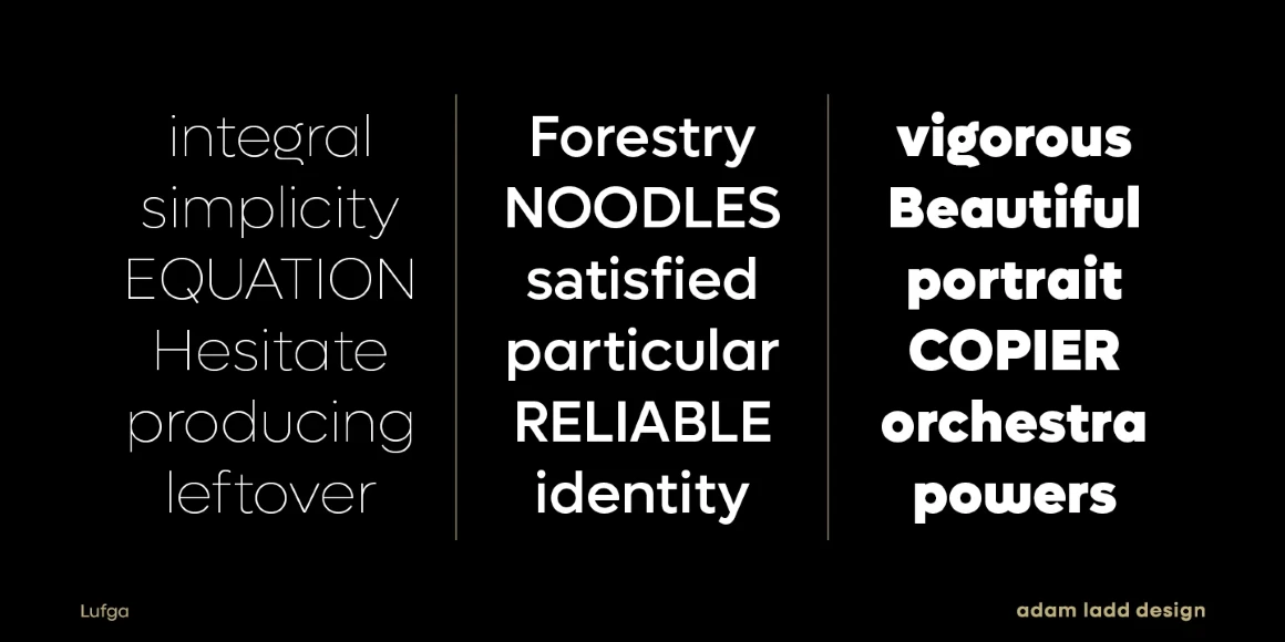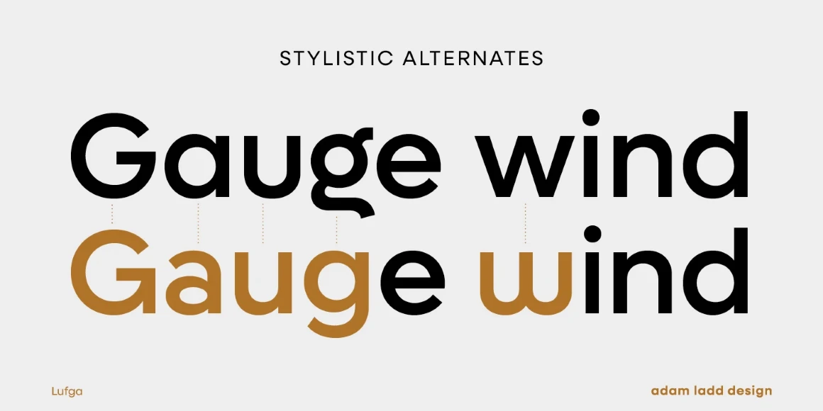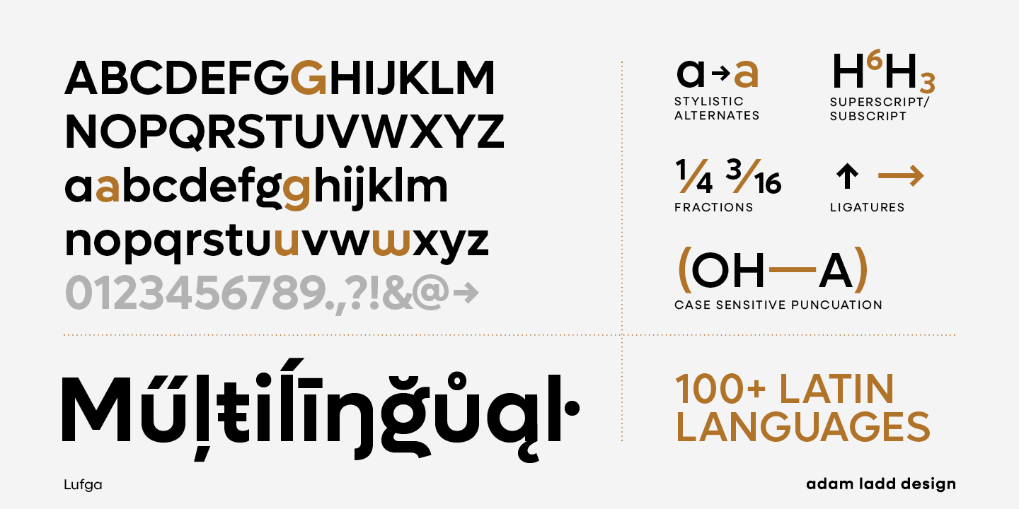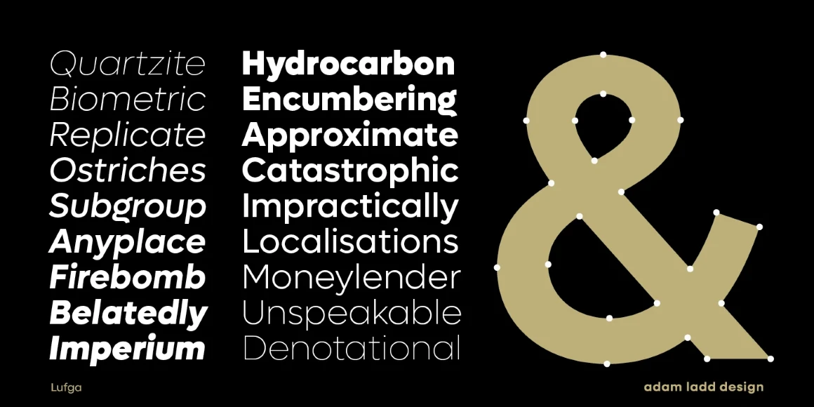 Lufga is a uniquely different, geometric sans serif font family. It has modern individuality and boasts distinctive alternates for when you want to set your project apart from the rest. Most notably, the unexpectedly unique double-story g and stemless u. With a minimal design, large x-height, and thin through black weights (with italics), Lufga is versatile, from reliable text to stylish display. The opportunities are endless! Branding, advertising, packaging, magazines, websites and more!