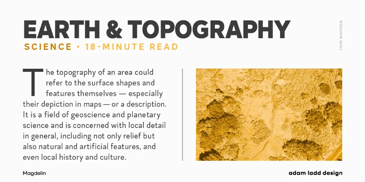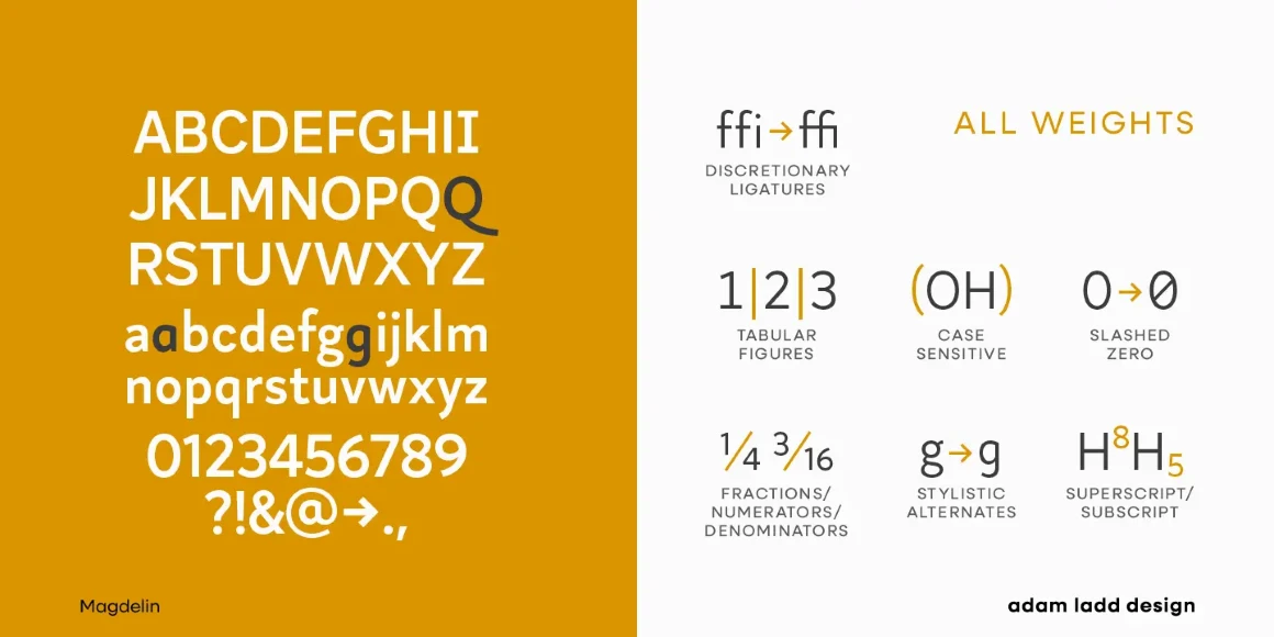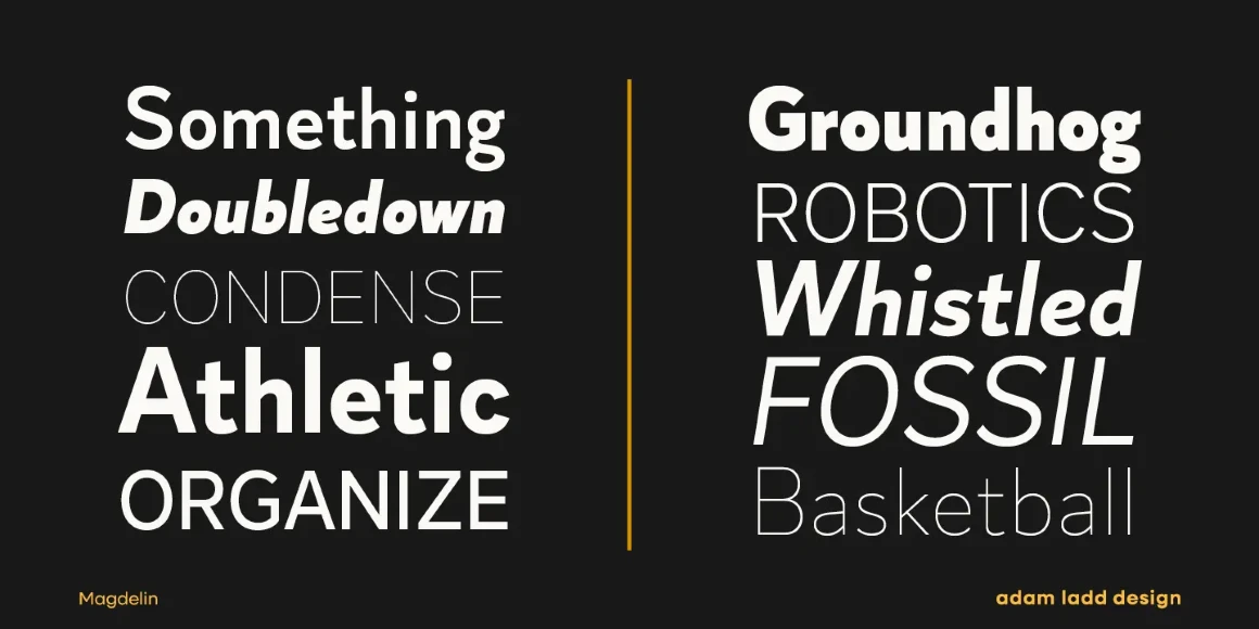 At its core, Magdelin is a minimal Gothic sans having simple forms and low contrast. Yet, it takes some cues from the Humanist class with its calligraphic details found in the italics. The small x-height, long ascenders and descenders, and semi-condensed proportions give it a classic vintage feel while appearing stylish and modern in current typographic landscapes. The clean design makes it a valuable, versatile workhorse, great for branding, packaging, editorial, books, websites, and more.