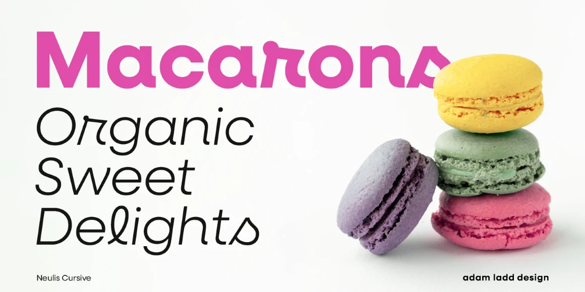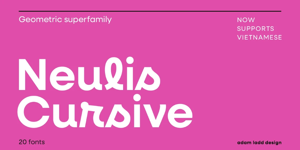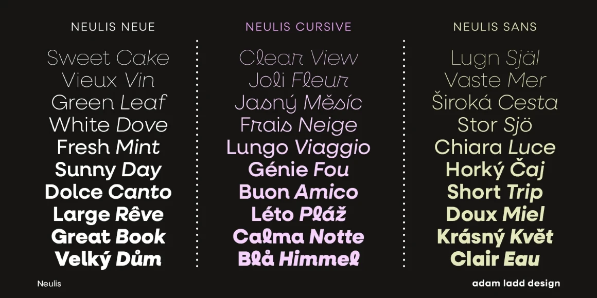 Neulis Neue, Neulis Cursive, and Neulis Sans are, to varying degrees, a mash-up of a geometric sans serif and jovial upright script. Neulis Neue, once Neulis Alt, is pleasantly warm thanks to a handful of primary letterforms. Neulis Cursive, formerly Neulis, is the most playful of the bunch — punctuated with script-like letterforms. And Neulis Sans, brand new to the family, is geometric and dependable. Think of the three families on a dial; how much fun do you want to inject into your project?