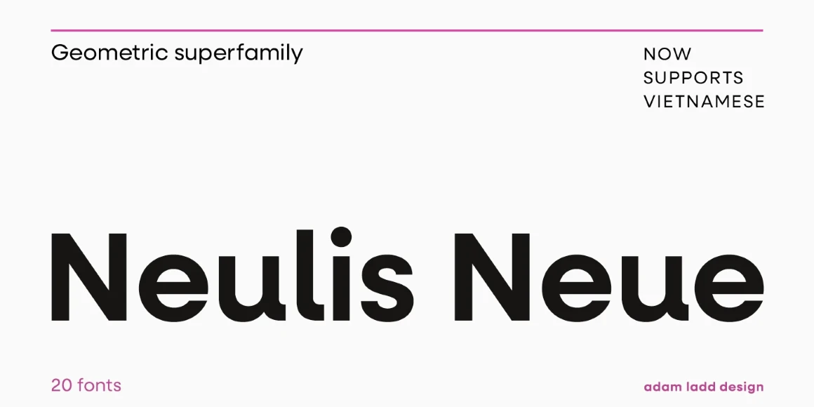 Neulis Neue, Neulis Cursive, and Neulis Sans are, to varying degrees, a mash-up of a geometric sans serif and jovial upright script. Neulis Neue, once Neulis Alt, is pleasantly warm thanks to a handful of primary letterforms. Neulis Cursive, formerly Neulis, is the most playful of the bunch — punctuated with script-like letterforms. And Neulis Sans, brand new to the family, is geometric and dependable. Think of the three families on a dial; how much fun do you want to inject into your project?