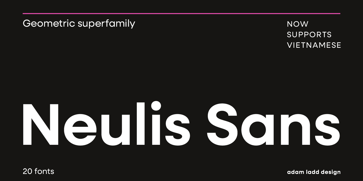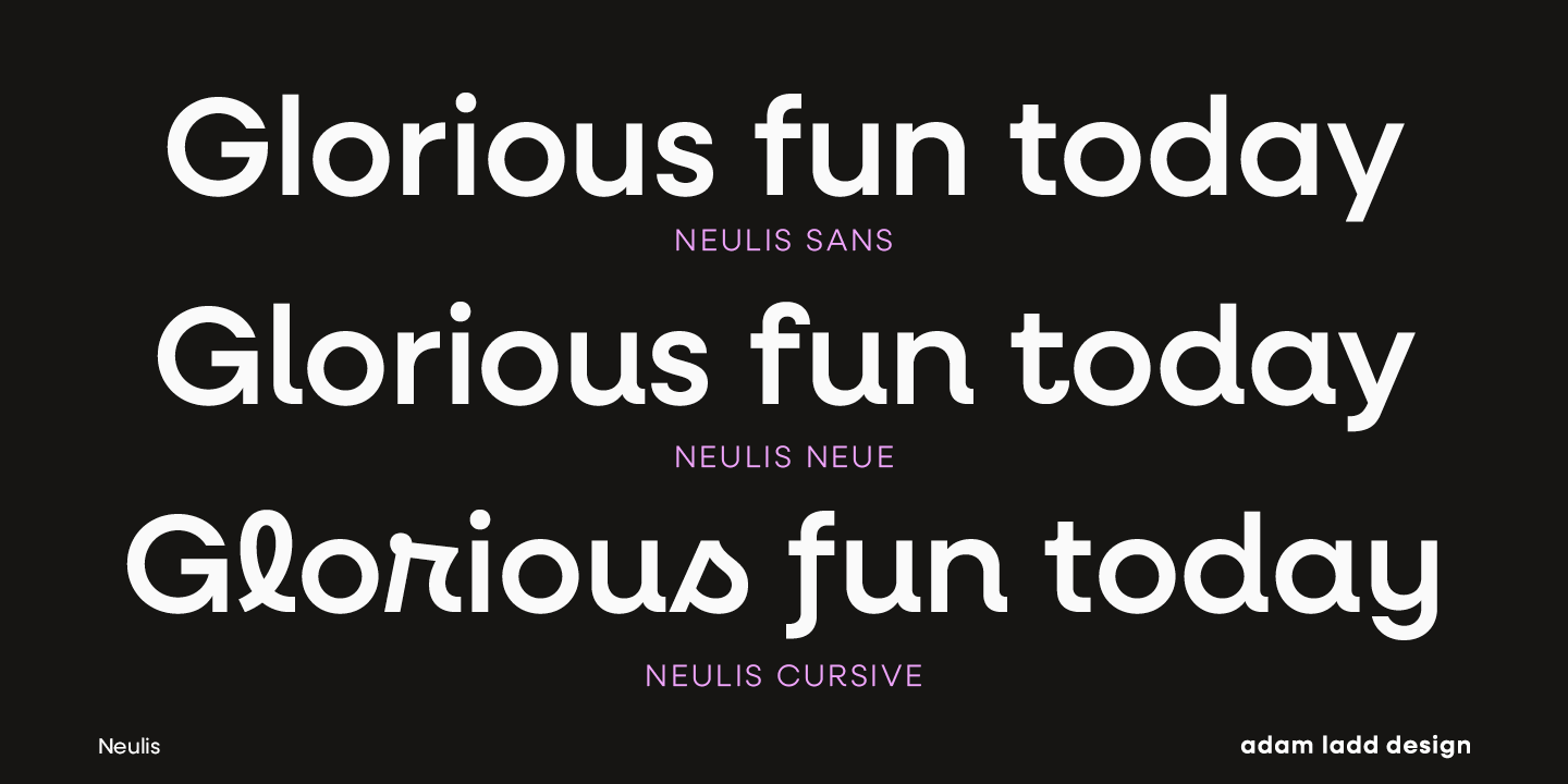 Neulis Neue, Neulis Cursive, and Neulis Sans are, to varying degrees, a mash-up of a geometric sans serif and jovial upright script. Neulis Neue, once Neulis Alt, is pleasantly warm thanks to a handful of primary letterforms. Neulis Cursive, formerly Neulis, is the most playful of the bunch — punctuated with script-like letterforms. And Neulis Sans, brand new to the family, is geometric and dependable. Think of the three families on a dial; how much fun do you want to inject into your project?