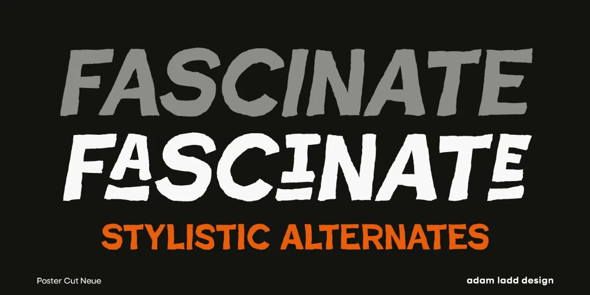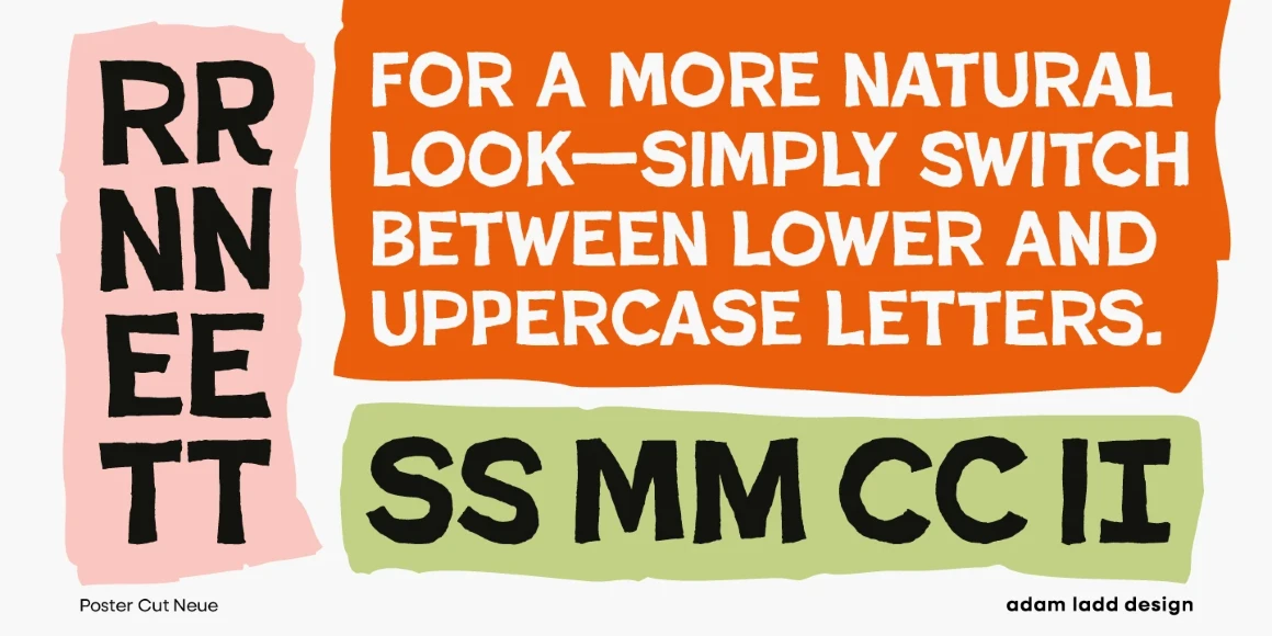 Poster Cut Neue is a purposefully rough, hand-drawn display family. Loosely inspired by the historic grotesque sans, the all-cap design offers an informal, almost hand-cut look and feel. The uppercase and lowercase are different enough to give the text a hand-lettered sense of movement and energy. Poster Cut Neue, regular and italic, is ideal for brand, editorial, publication, poster, and packaging design applications when you want the work to feel organically natural or tenaciously grassroots.