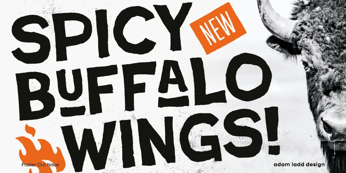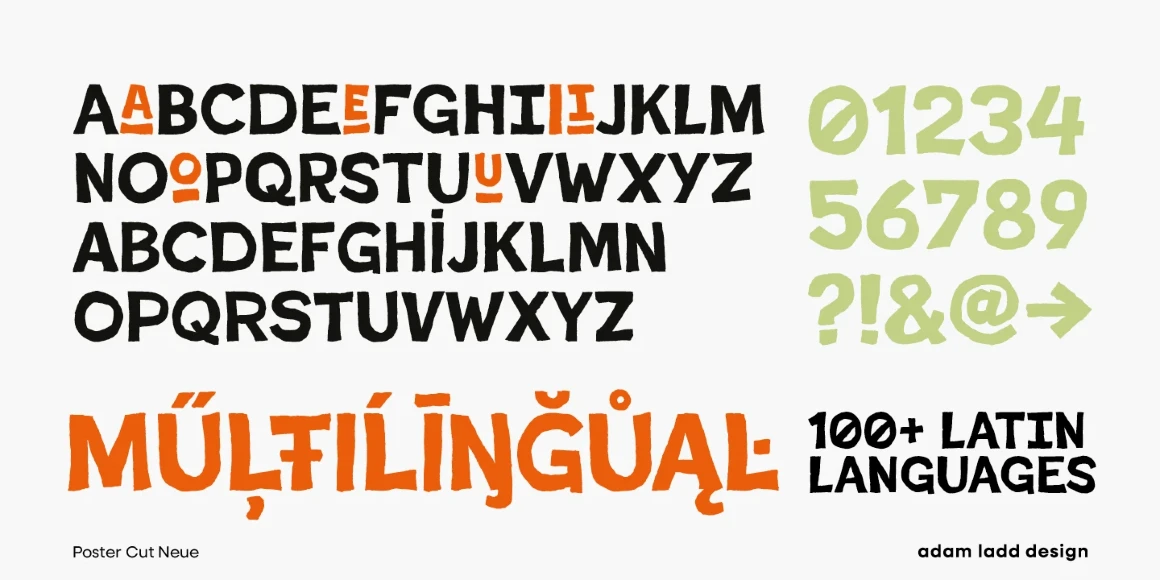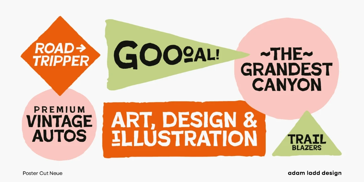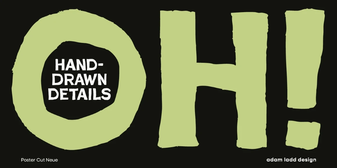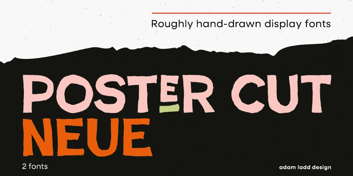Poster Cut Neue is a purposefully rough, hand-drawn display family. Loosely inspired by the historic grotesque sans, the all-cap design offers an informal, almost hand-cut look and feel. The uppercase and lowercase are different enough to give the text a hand-lettered sense of movement and energy. Poster Cut Neue, regular and italic, is ideal for brand, editorial, publication, poster, and packaging design applications when you want the work to feel organically natural or tenaciously grassroots.