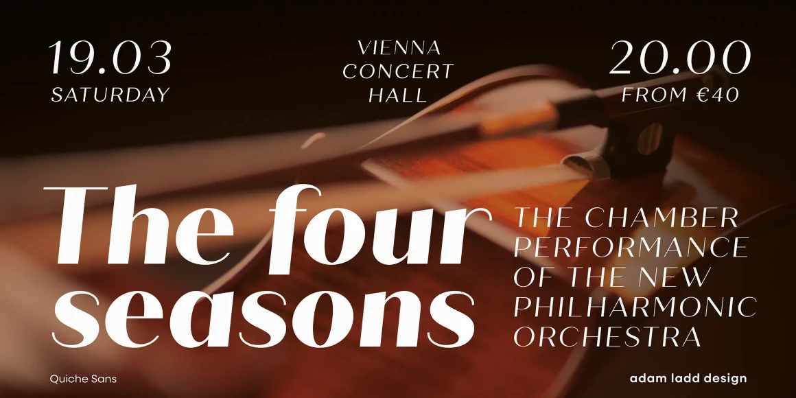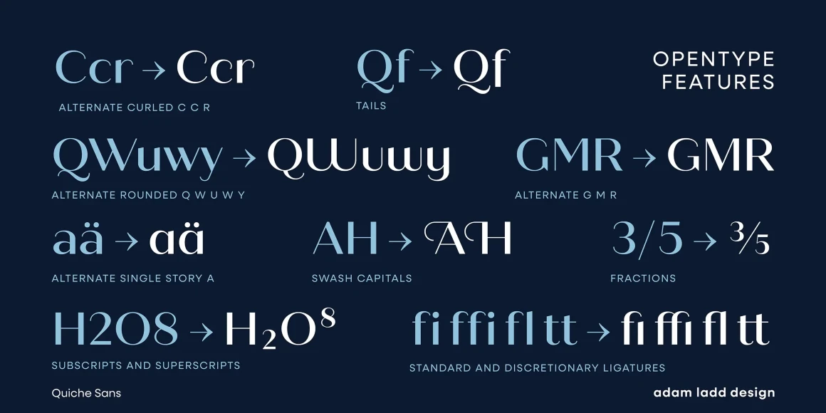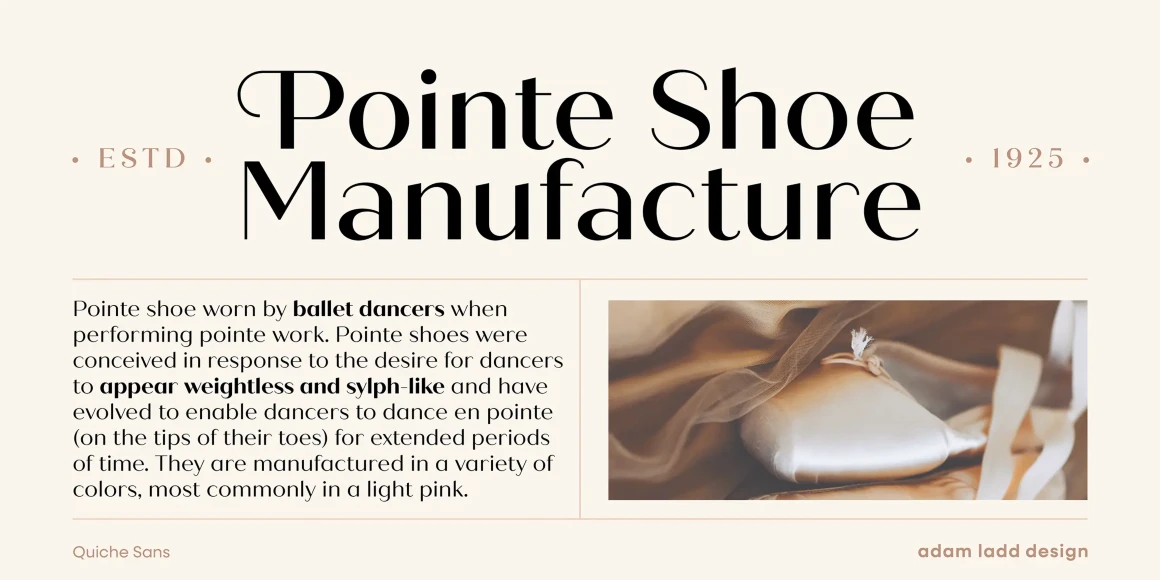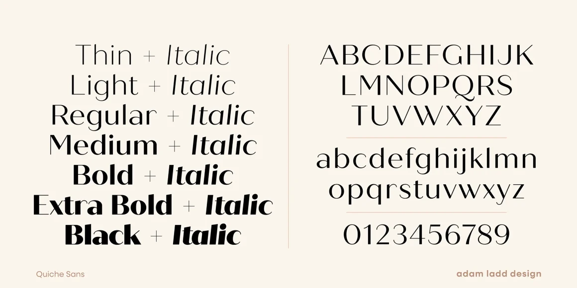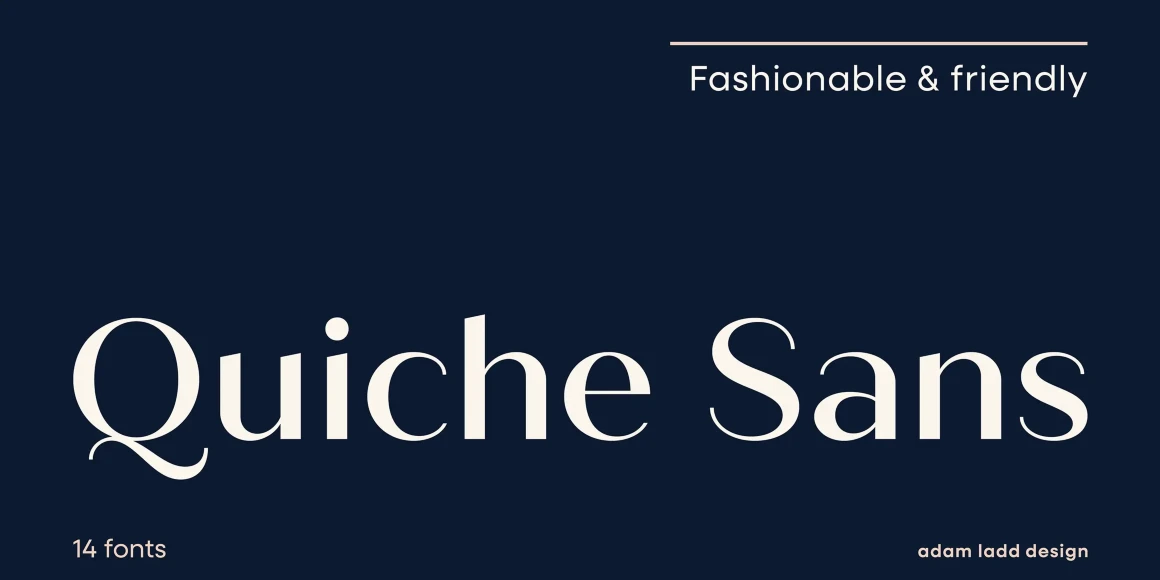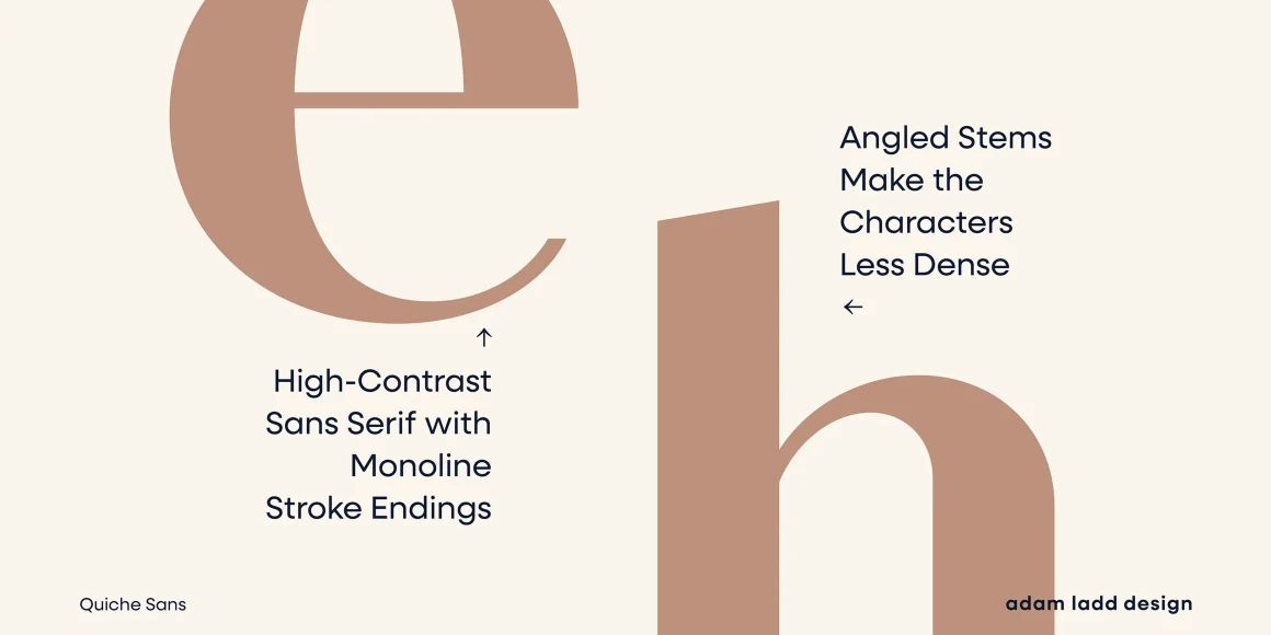 Quiche Sans is a high-contrast sans with monolinear stroke endings, angled stems, and geometric proportions. A sibling to Quiche, the design is also influenced by the Didone genre, characterized by its elegance and extreme contrast. But with the serifs removed, it becomes uniquely modern. Quiche Sans is ready for branding, advertising, magazines, products, packaging, labels, invitations, stationery, fashion, and more. Use it with Quiche to expand the versatility even further!