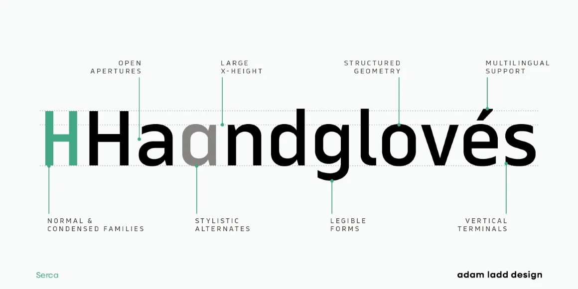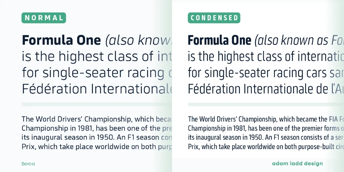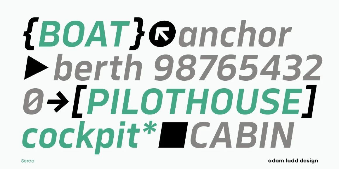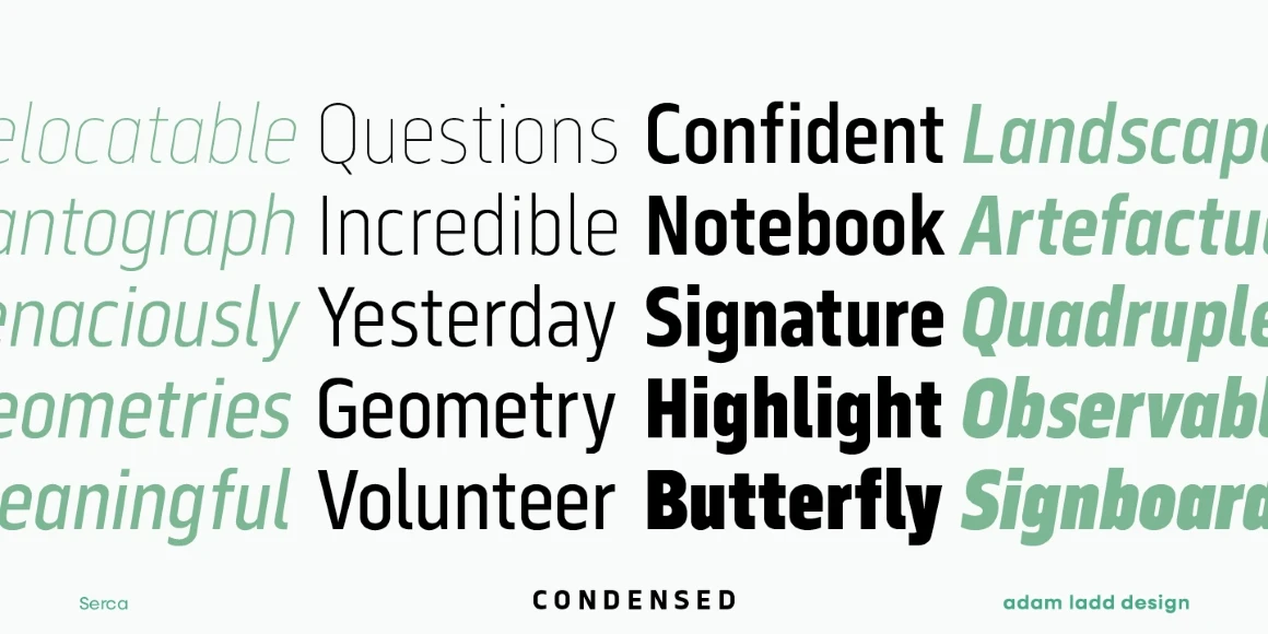 Serca and Serca Condensed are a grotesque sans family residing at the crossroads of business and design. It is precise without being cold and modern without being sterile. Because of the open counters and proportions, it can easily be used in both small text and large headlines. The well-considered typefaces lend themselves to brand systems, wayfinding plans, and marketing strategies. Combined, the families have 40 styles, including italics. The possibility for typographic variety is endless.