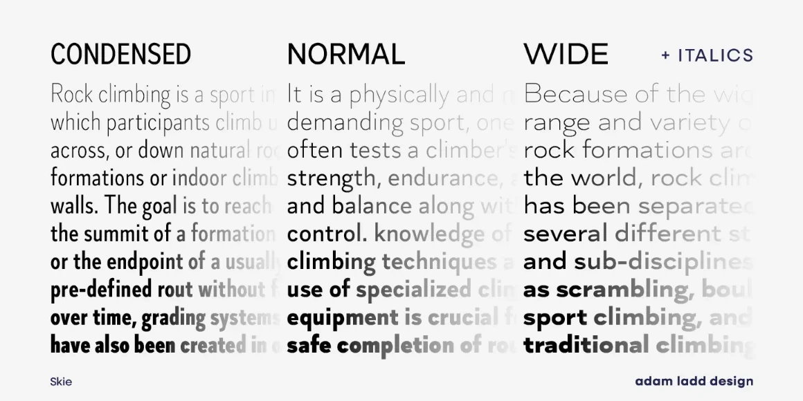 Skie is an inconspicuously alluring gothic sans standing apart from the crowd. Considered a superfamily, it’s a hidden gem full of branding, publishing, and marketing potential. The straightforward design achieves a neutral appearance, blending modern aesthetics with a hint of revived charm. The comprehensive Skie family has 60 fonts distributed and 10 weights per family: normal, condensed, and wide, including italics. Skie is the right choice to achieve your intended visual communication goals.
