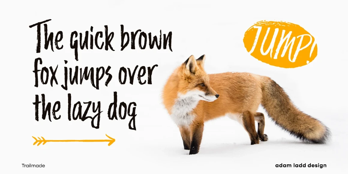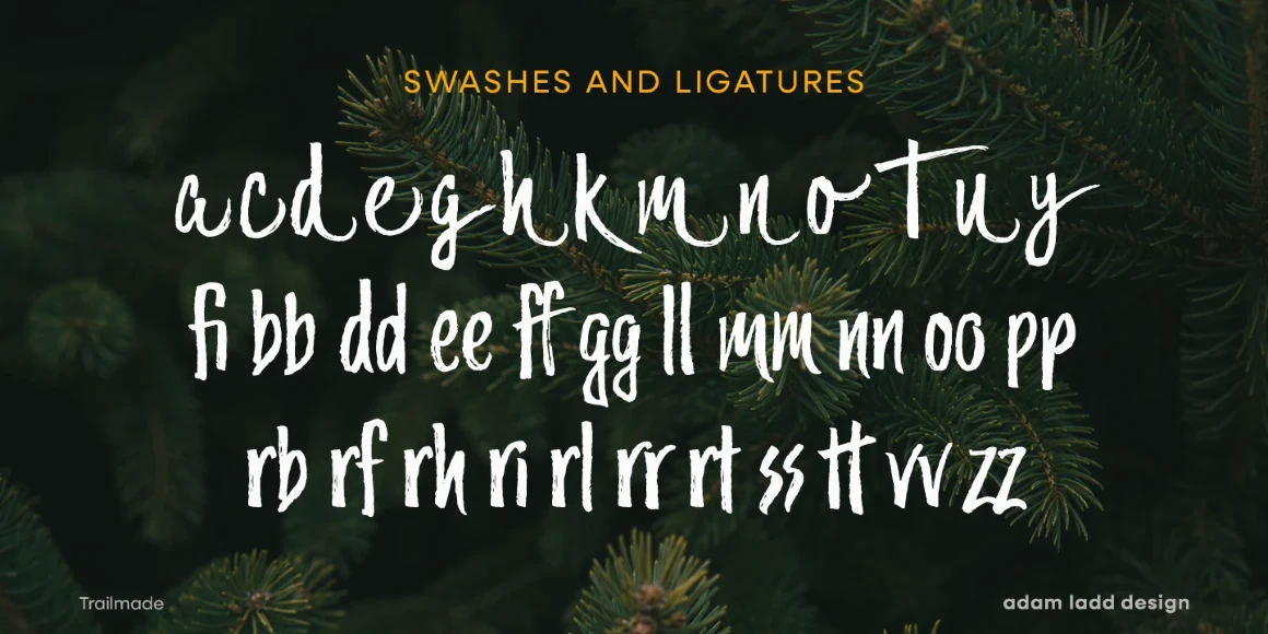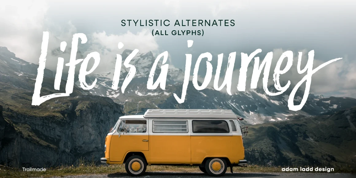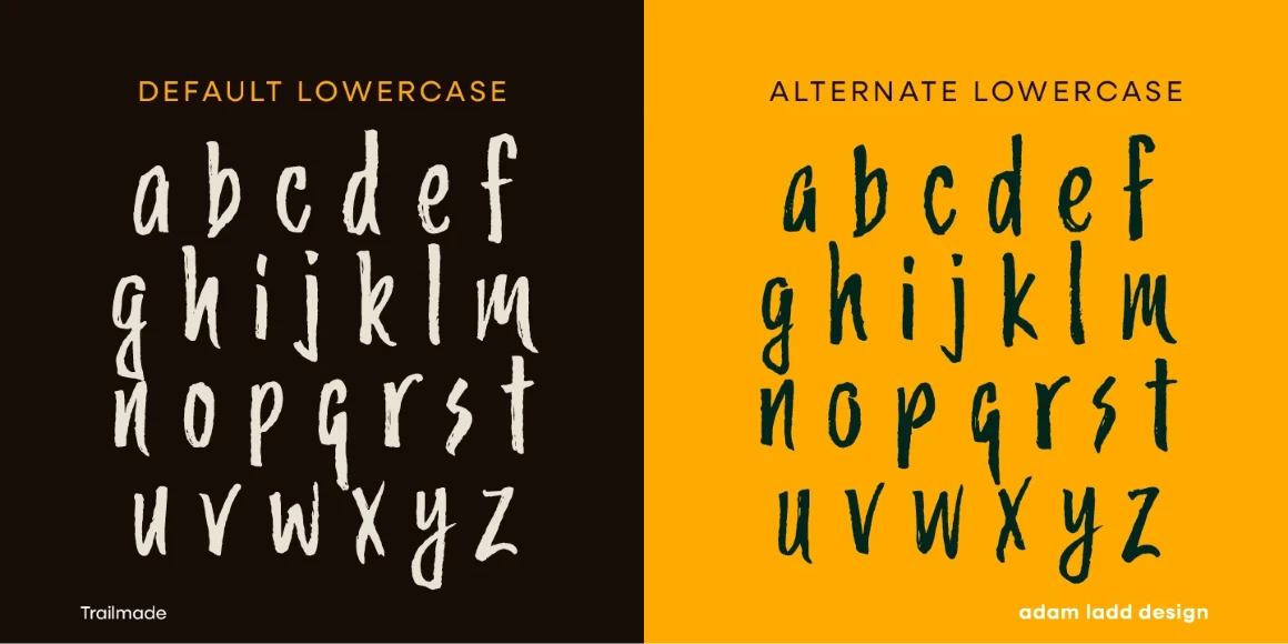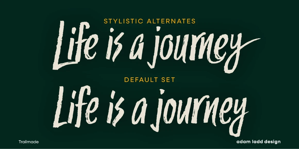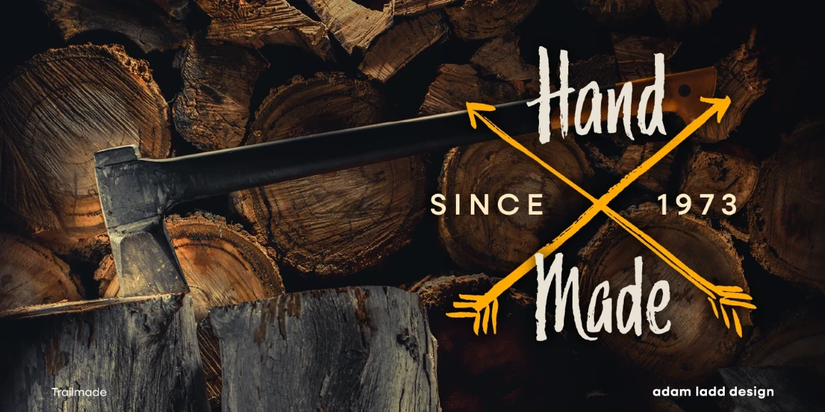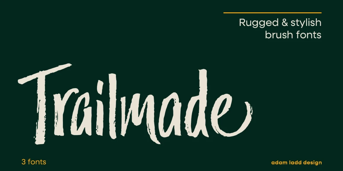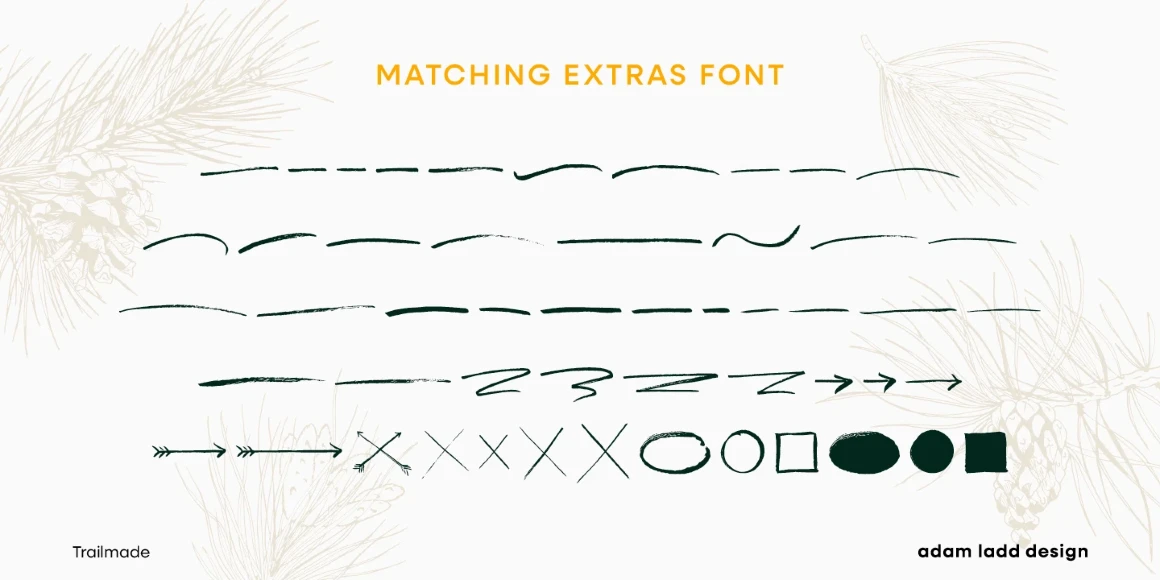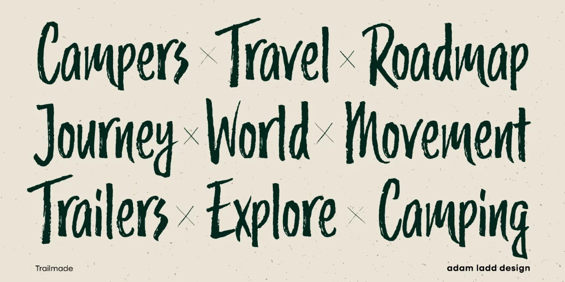 Trailmade is a rugged and stylish brush script ready to explore an adventurous path. This typeface ventures a little outside the genre but still carries echoes of it. Hand-lettered with a brush pen on paper, Trailmade includes swashes, ligatures, and a complete second set of lowercase stylistic alternates to switch in and out for a more hand-lettered feel. The matching Extras font features various lines and dingbats to complement and enhance your wild and untamed graphic design projects.