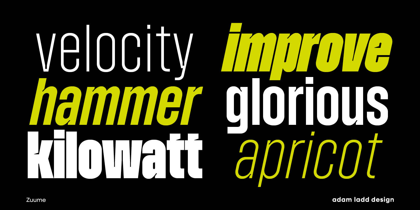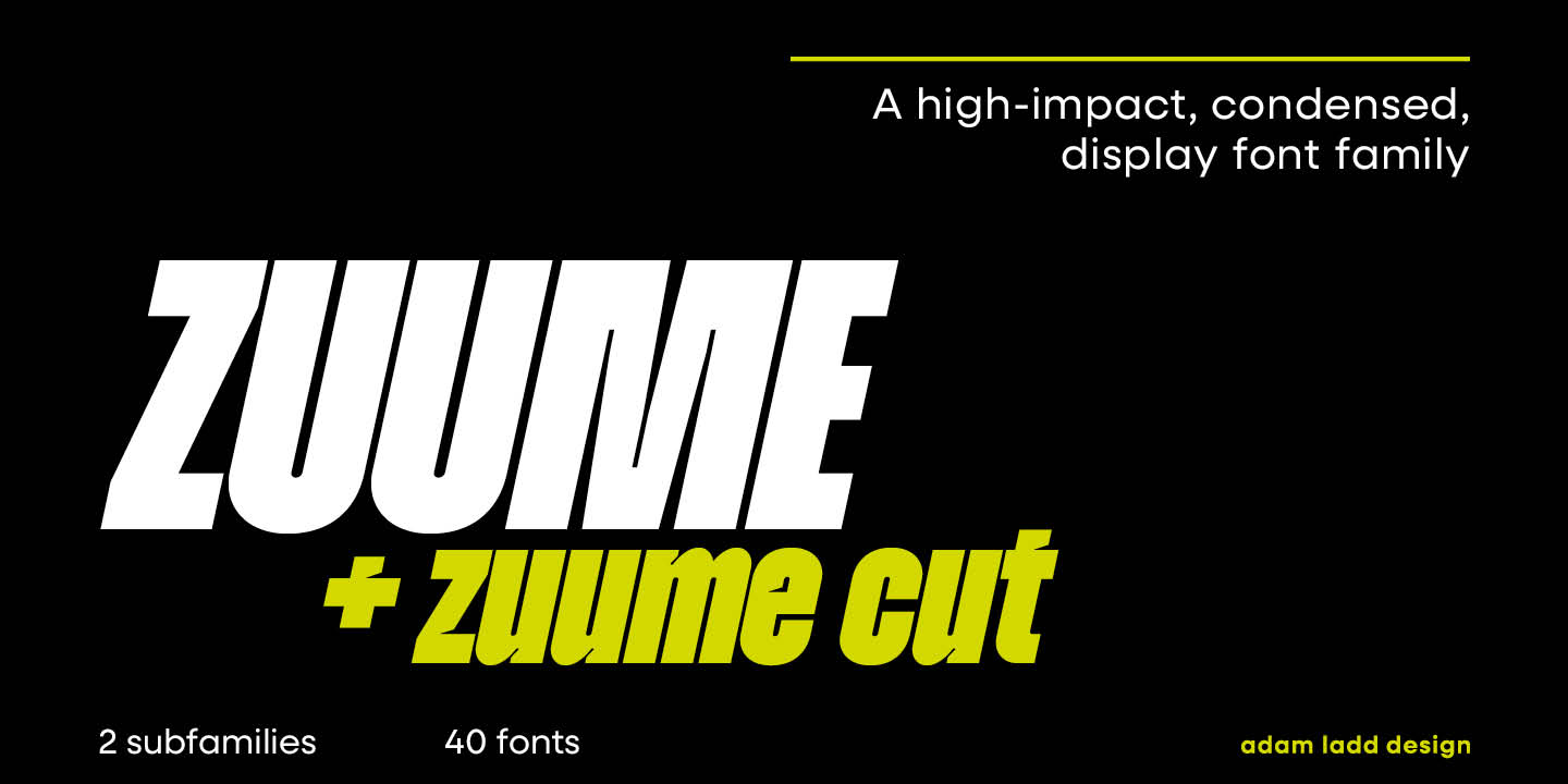 Zuume Edge and Zuume Edge Cut are certifiable look-at-me powerhouses. These typefaces are built to invigorate magazine headlines, media brands, fitness packaging, in-your-face entertainment, or anywhere else designers need maximum impact. The design has a sharp, mechanical feel that looks great, tightly spaced and stacked for a visual punch. The sliced-out segments in Zuume Edge Cut create more movement, aggression, and willful speed. The sturdy Zuume and Zuume Cut will leave an indelible mark!