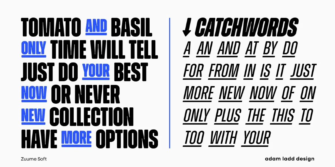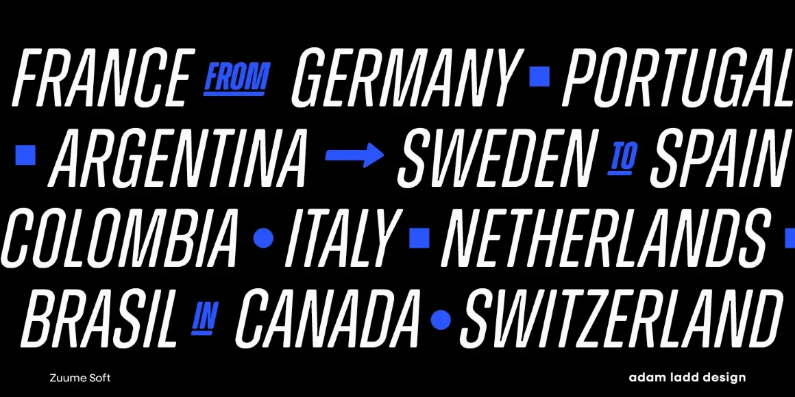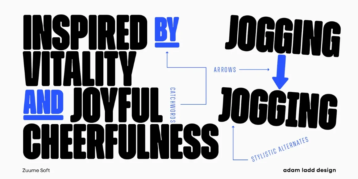 Zuume Soft is a charismatically dichotomous condensed sans. Sister to Zuume, it is staunchly upright in its stance, but round where corners should exist. This family will enliven magazine headlines, media brands, fitness packaging, kidlit book covers, in-your-face sports entertainment, festival posters, or anywhere else designers want to create playful drama. The family ranges from a delicate Light to an impactful Black. Use the compelling and versatile Zuume Soft and make your voice heard.