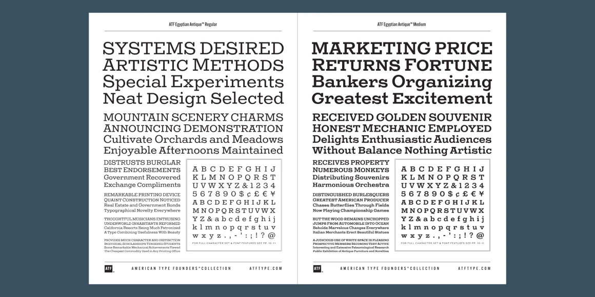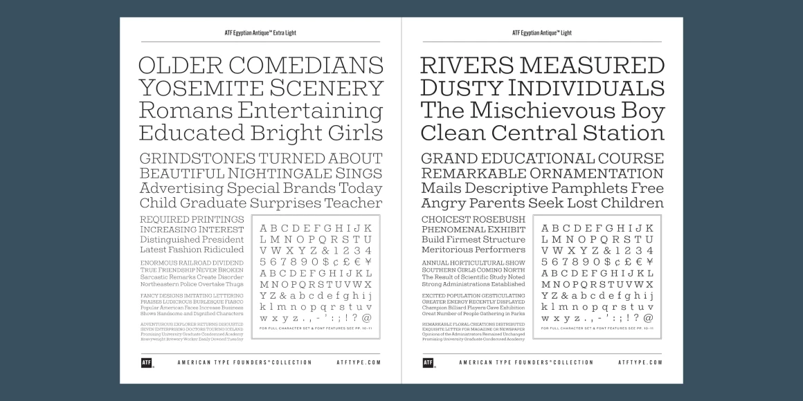 ATF Egyptian Antique is an expansion of Schruabstädter’s design to six weights. A new feature is the addition of small caps, essential for headings and useful as alternative capitals in upper-and-lowercase settings. The x-height has been slightly increased to better balance with the caps, and while some letterforms have been refined, the family stays true to the eccentricities and antique quality of Schraubstädter’s Egyptian gem.