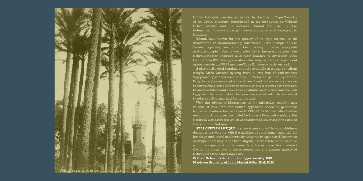 A slab-serif metal typeface initially available in a single medium weight, Litho Antique sprang from a long line of 19th-century “Egyptian” typefaces used widely in Victorian printed ephemera. Egyptian styles were typically slab-serif, and had no real connection to Egypt. Napoleon’s Egyptian campaign led to a craze for Egyptian-themed furniture and decorative goods during the Victorian era. The Egyptian theme somehow became associated with the slab-serif typefaces of the time, and the name stuck.