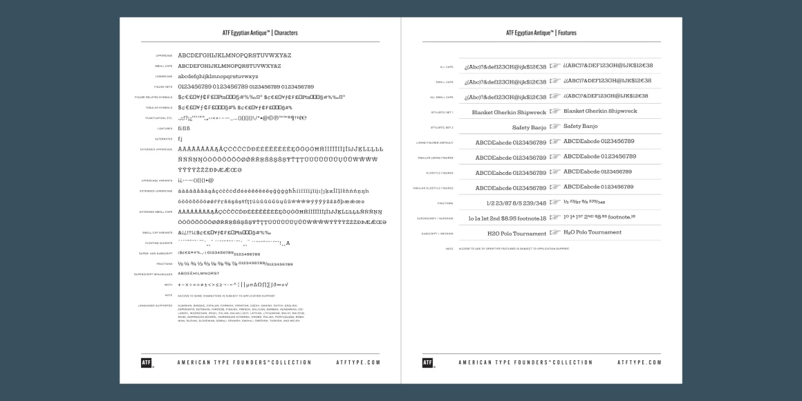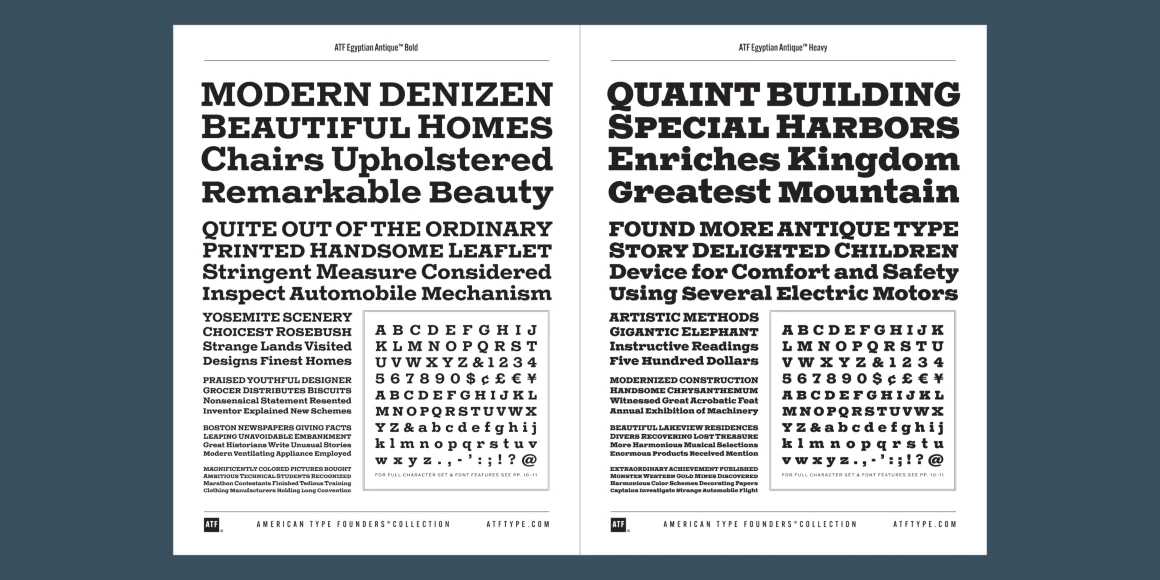 ATF Egyptian Antique is an expansion of Schruabstädter’s design to six weights. A new feature is the addition of small caps, essential for headings and useful as alternative capitals in upper-and-lowercase settings. The x-height has been slightly increased to better balance with the caps, and while some letterforms have been refined, the family stays true to the eccentricities and antique quality of Schraubstädter’s Egyptian gem.