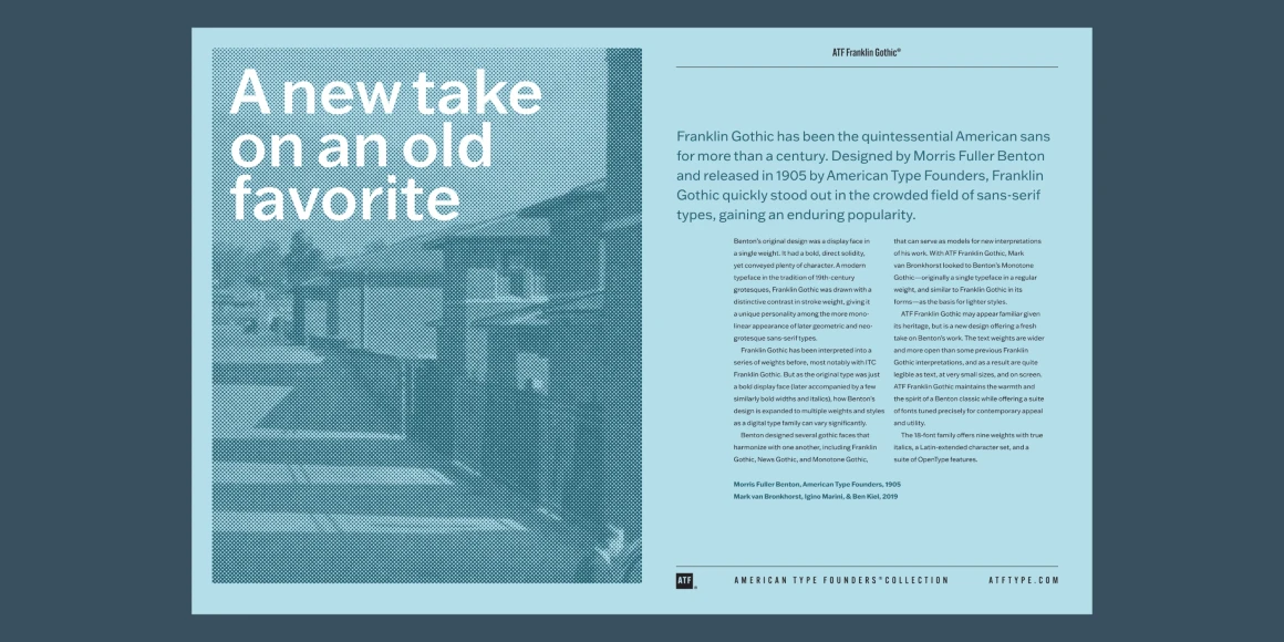 Franklin Gothic has been the quintessential American sans for more than a century. Designed by Morris Fuller Benton and released in 1905 by American Type Founders, Franklin Gothic quickly stood out in the crowded field of sans-serif types, gaining an enduring popularity.