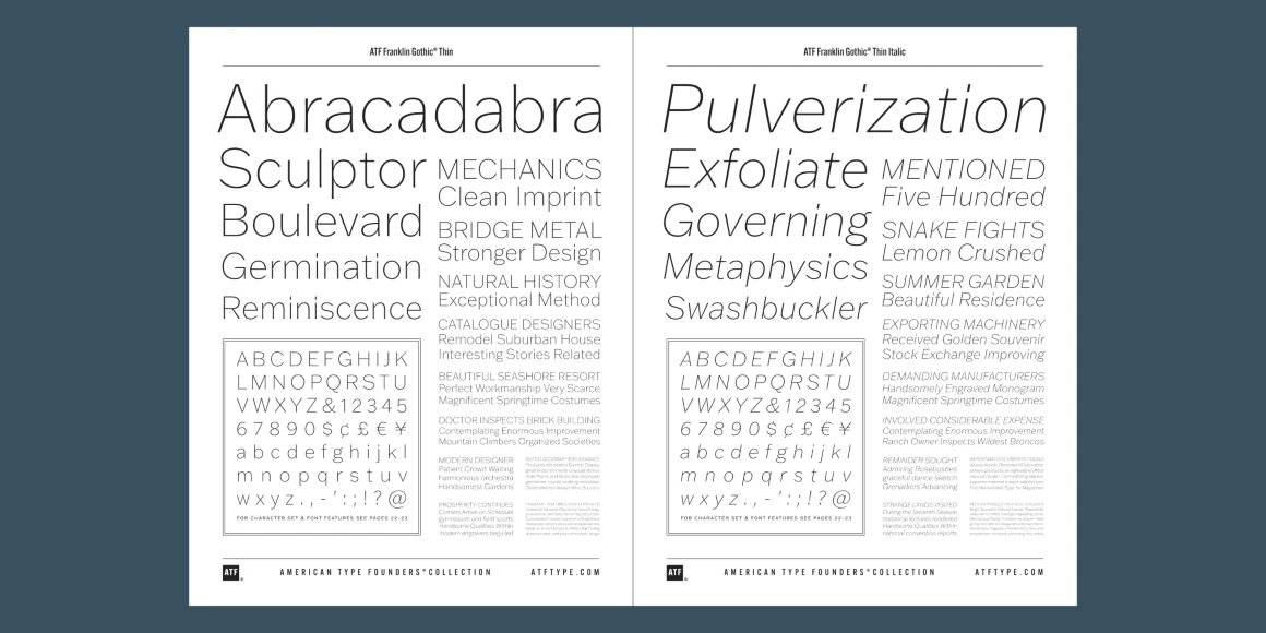 ATF Franklin Gothic may appear familiar given its heritage, but is a new design offering a fresh take on Benton’s work. The text weights are wider and more open than some previous Franklin Gothic interpretations, and as a result are quite legible as text, at very small sizes, and on screen. ATF Franklin Gothic maintains the warmth and the spirit of a Benton classic while offering a suite of fonts tuned precisely for contemporary appeal and utility.