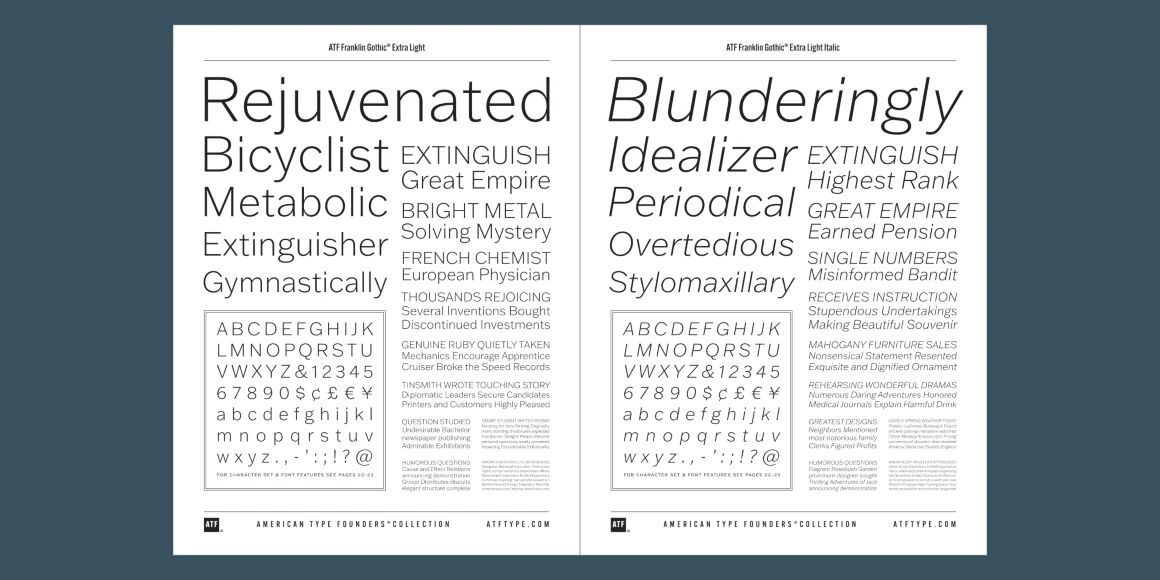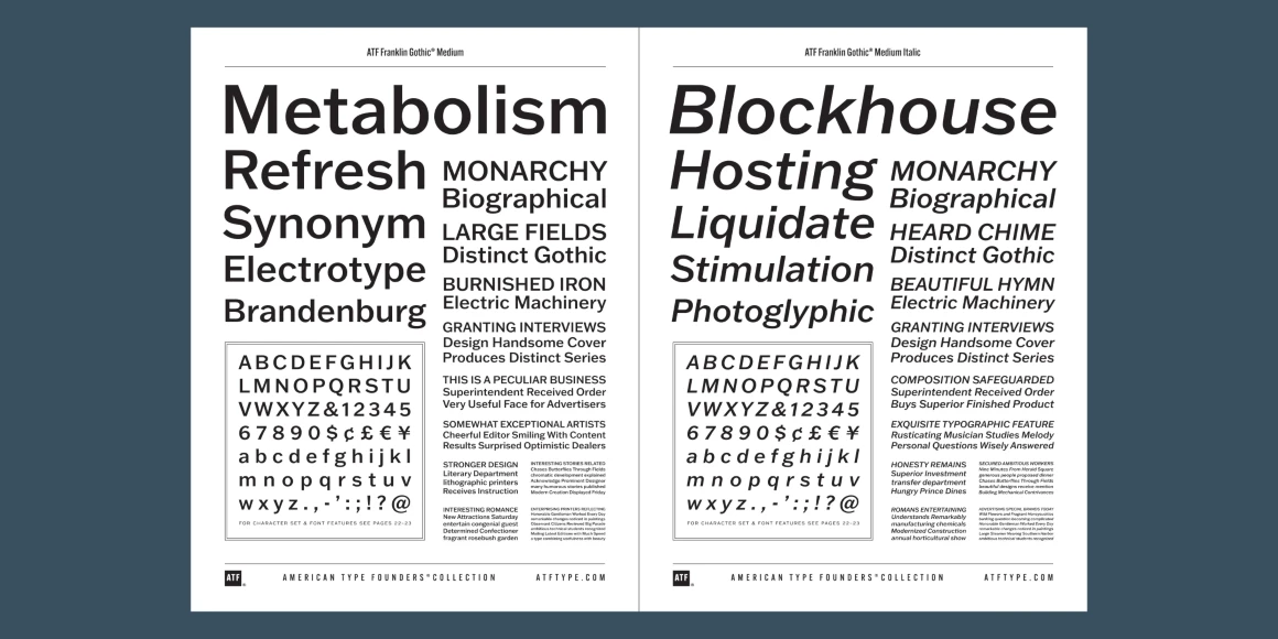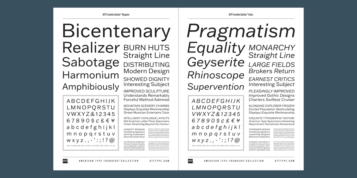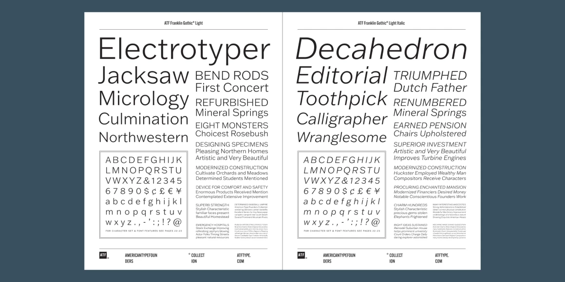 Franklin Gothic has been the quintessential American sans for more than a century. Designed by Morris Fuller Benton and released in 1905 by American Type Founders, Franklin Gothic quickly stood out in the crowded field of sans-serif types, gaining an enduring popularity.