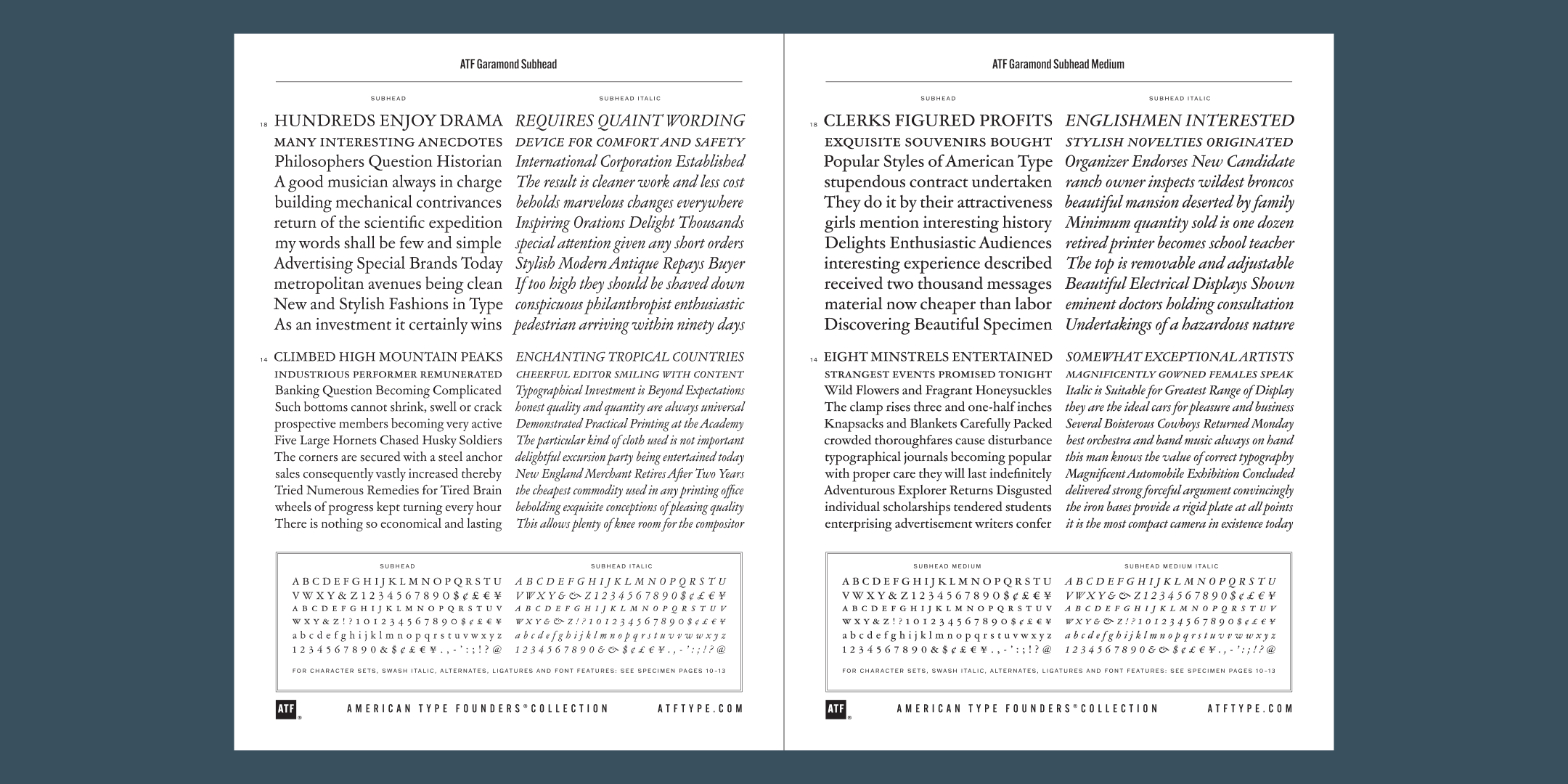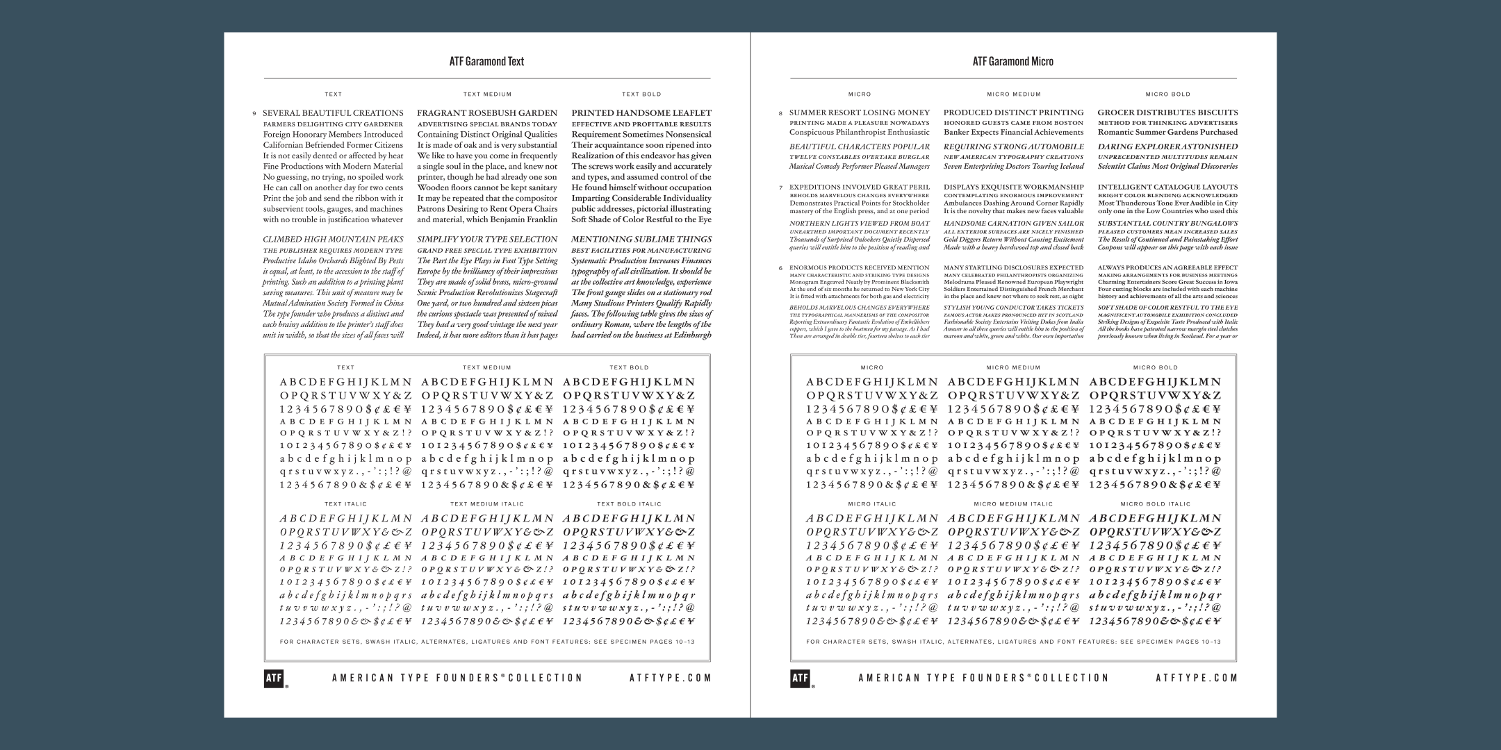 The new ATF Garamond expands upon a legacy of quality and craftsmanship, bringing back some of the robustness of metal type and letterpress printing often lost in digital adaptations of historic faces. The graceful, almost lacy appearance of some letterforms is complemented by a solid, sturdy outline that holds up in text at small sizes. Eighteen fonts comprise three optical sizes (Subhead, Text, Micro) and three weights, including a new medium weight that did not exist in metal. ATF Garamond also includes the alternates and swash characters from the original metal typeface.
