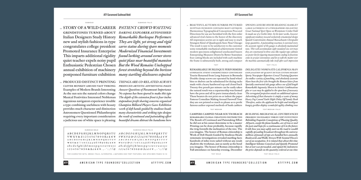 The new ATF Garamond expands upon a legacy of quality and craftsmanship, bringing back some of the robustness of metal type and letterpress printing often lost in digital adaptations of historic faces. The graceful, almost lacy appearance of some letterforms is complemented by a solid, sturdy outline that holds up in text at small sizes. Eighteen fonts comprise three optical sizes (Subhead, Text, Micro) and three weights, including a new medium weight that did not exist in metal. ATF Garamond also includes the alternates and swash characters from the original metal typeface.