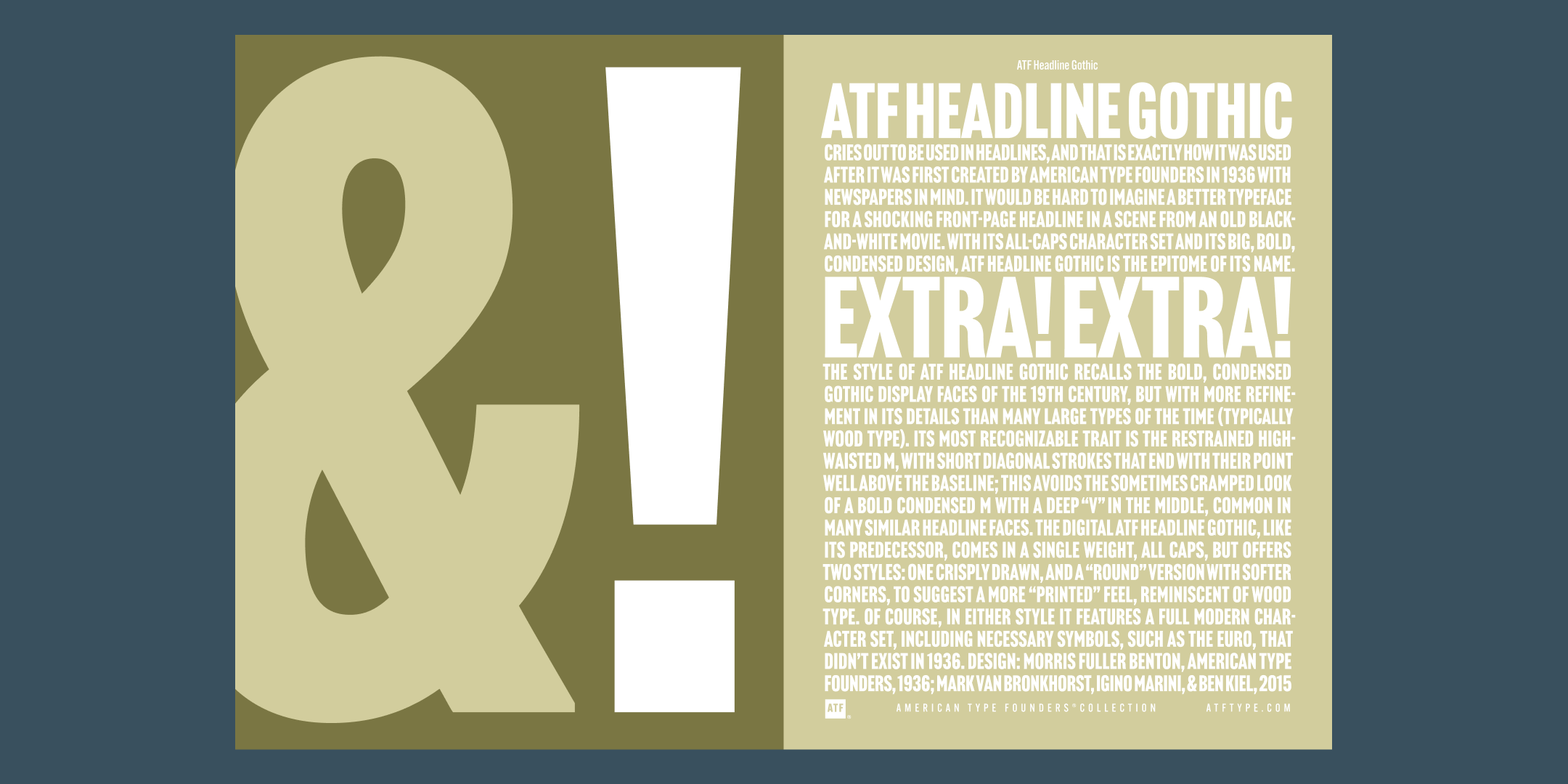 ATF Headline Gothic cries out to be used in headlines, and that is exactly how it was used after it was first created by American Type Founders in 1936 with newspapers in mind. It would be hard to imagine a better typeface for a shocking front-page headline in a scene from an old black-and-white movie. With its all-caps character set and its big, bold, condensed design, ATF Headline Gothic is the epitome of its name. Extra! Extra!