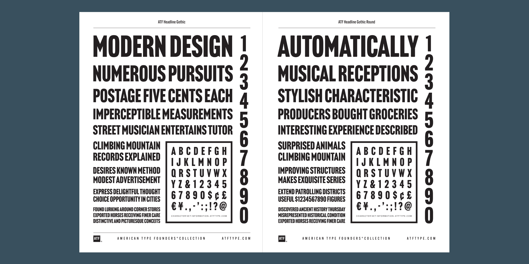 The style of ATF Headline Gothic recalls the bold, condensed gothic display faces of the 19th century, but with more refinement in its details than many large types of the time (typically wood type). Its most recognizable trait is the restrained high-waisted M, with short diagonal strokes that end with their point well above the baseline; this avoids the sometimes cramped look of a bold condensed M with a deep “V” in the middle, common in many similar headline faces. The digital ATF Headline Gothic, like its predecessor, comes in a single weight, all caps, but offers two styles: one crisply drawn, and a “Round” version with softer corners, to suggest a more “printed” feel, reminiscent of wood type. Of course, in either style it features a full modern character set, including necessary symbols, such as the Euro, that didn’t exist in 1936.