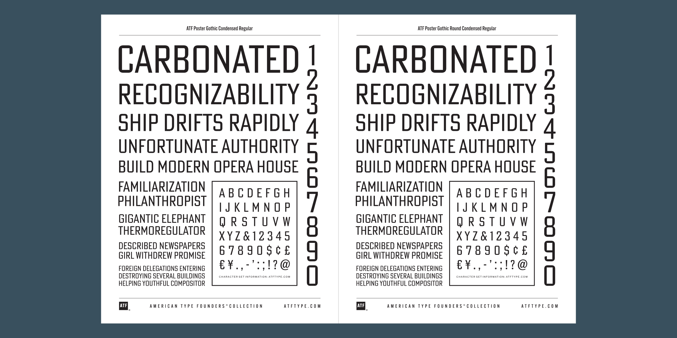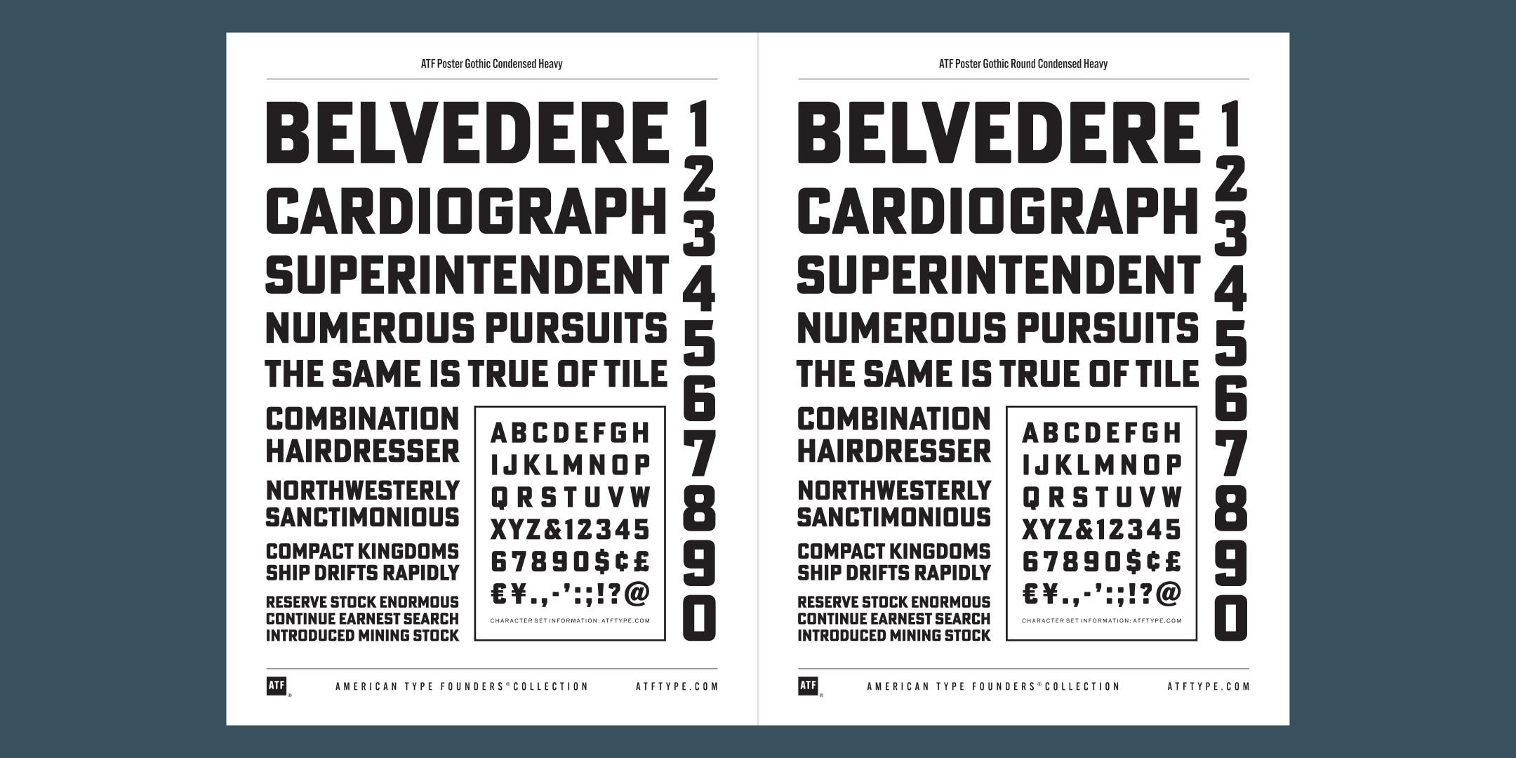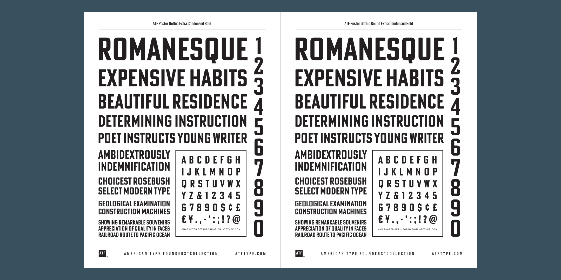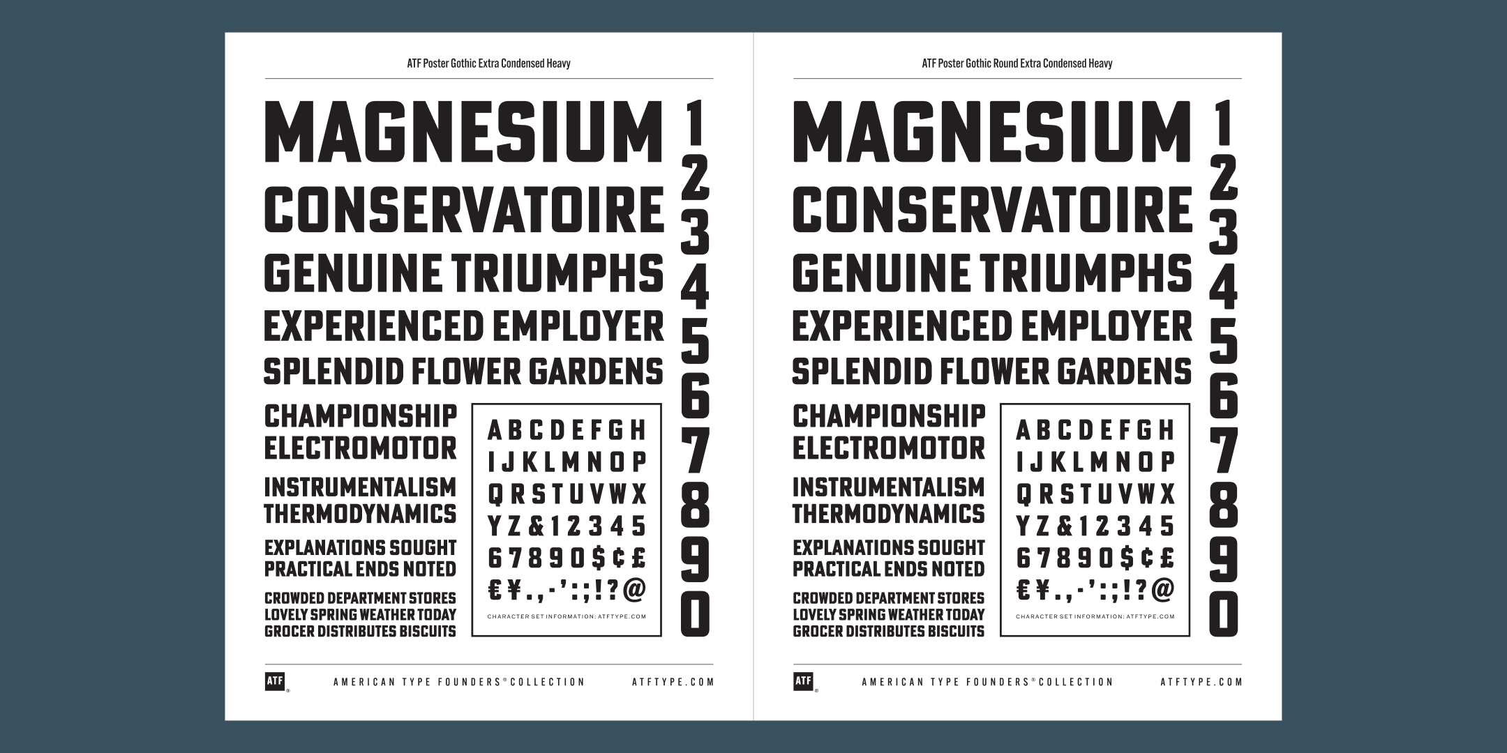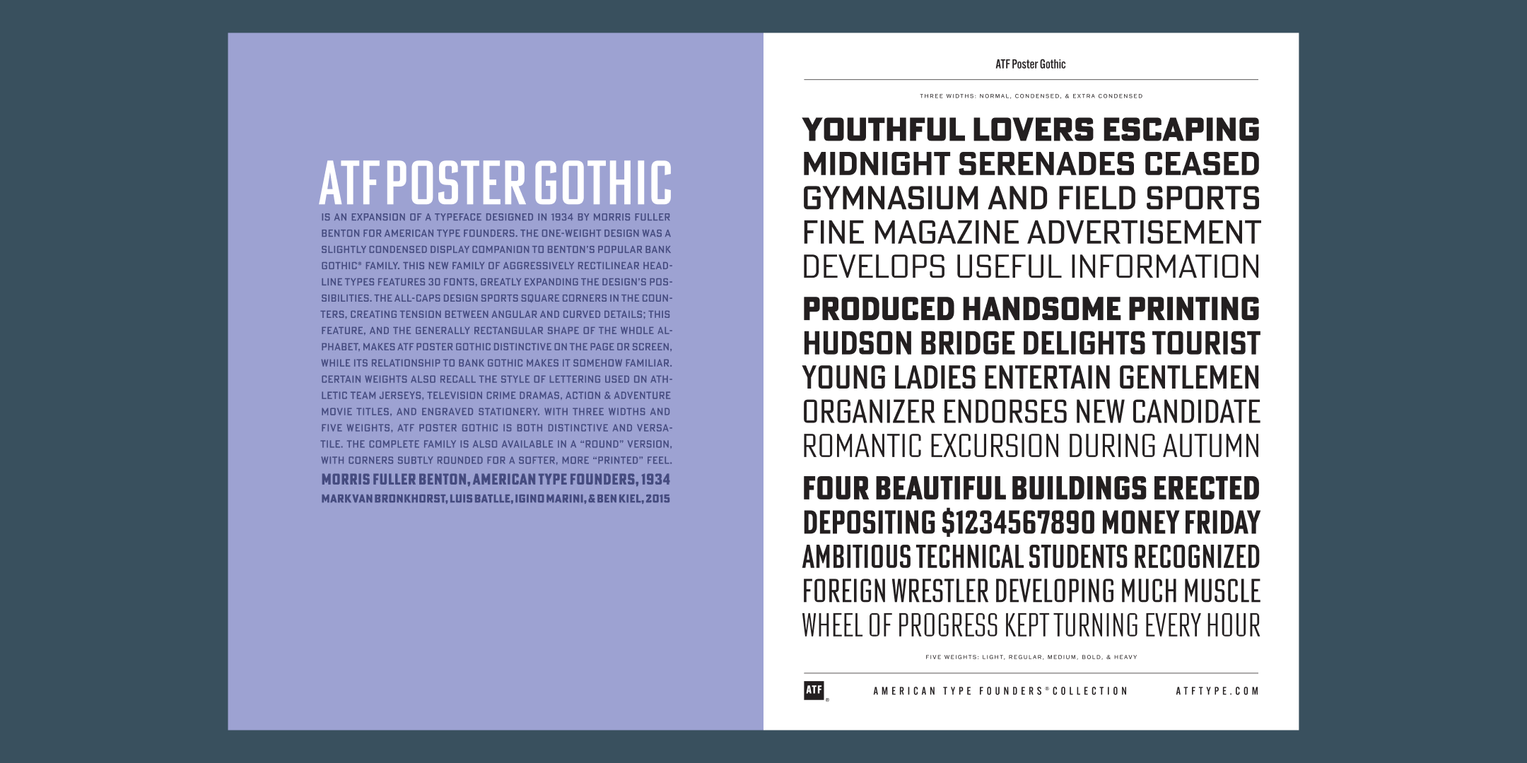 Certain weights also recall the style of lettering used on athletic team jerseys, television crime dramas, action & adventure movie titles, and engraved stationery. With three widths and five weights, ATF Poster Gothic is both distinctive and versatile. The complete family is also available in a “Round” version, with corners subtly rounded for a softer, more “printed” feel.