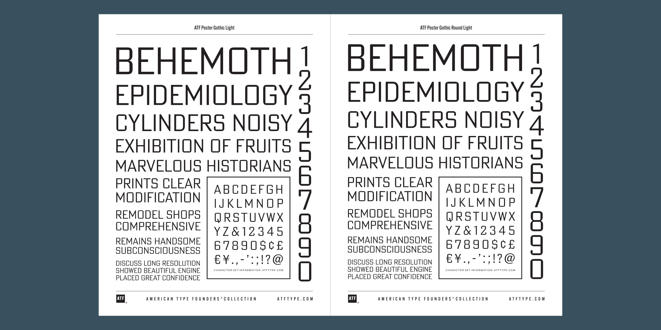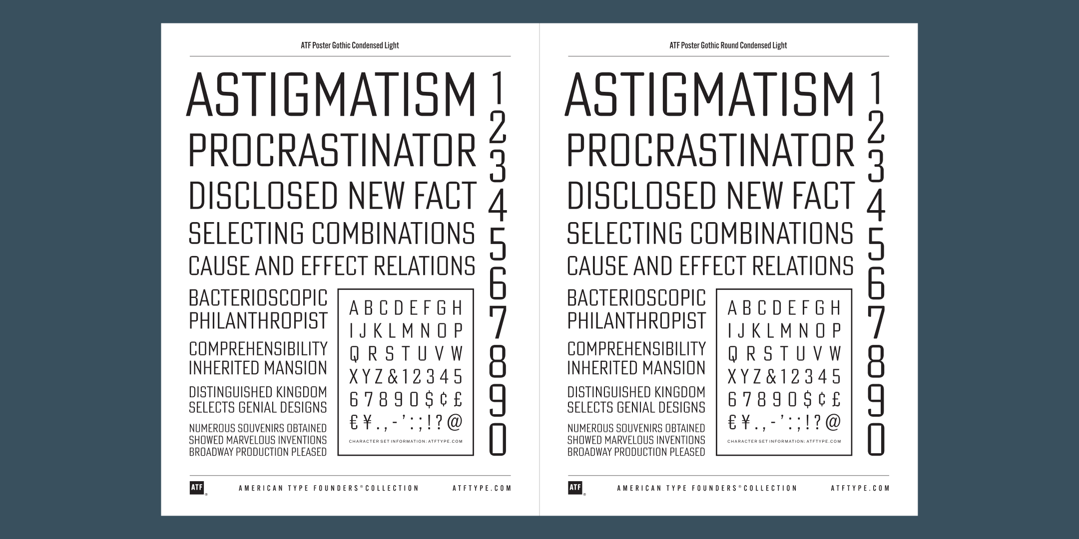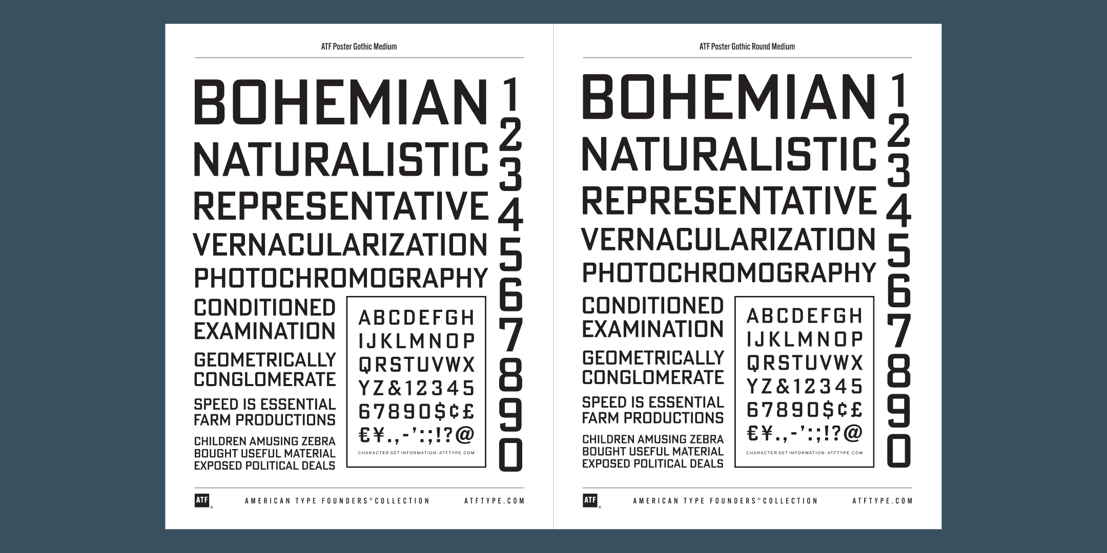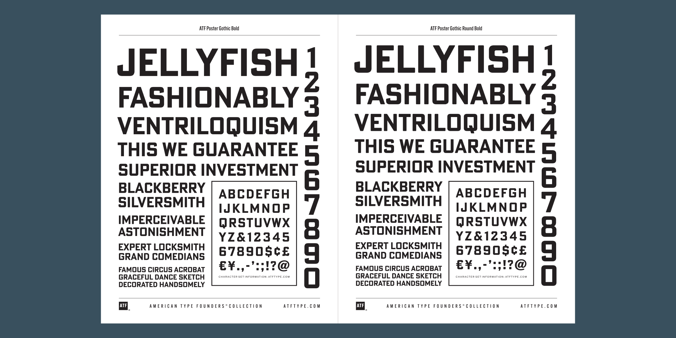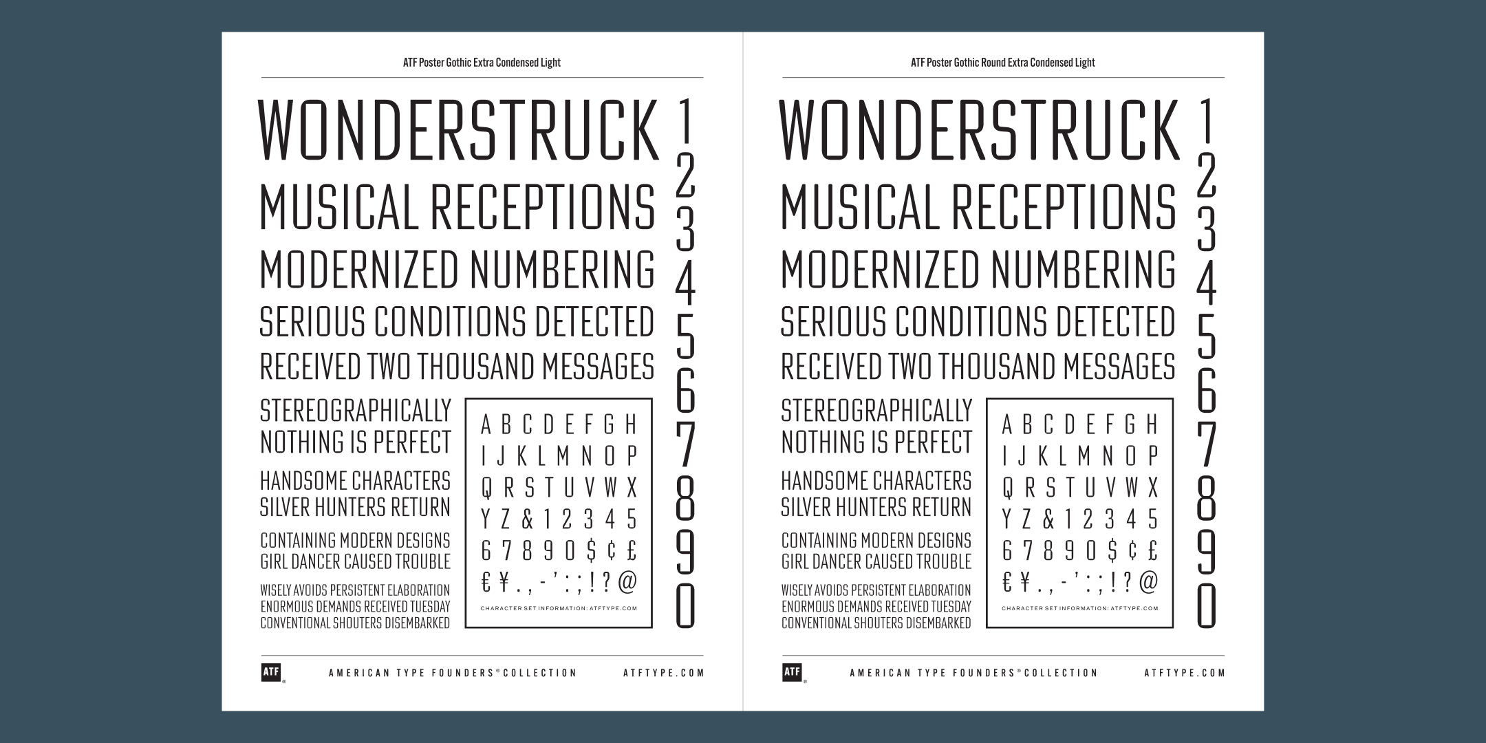 Certain weights also recall the style of lettering used on athletic team jerseys, television crime dramas, action & adventure movie titles, and engraved stationery. With three widths and five weights, ATF Poster Gothic is both distinctive and versatile. The complete family is also available in a “Round” version, with corners subtly rounded for a softer, more “printed” feel.