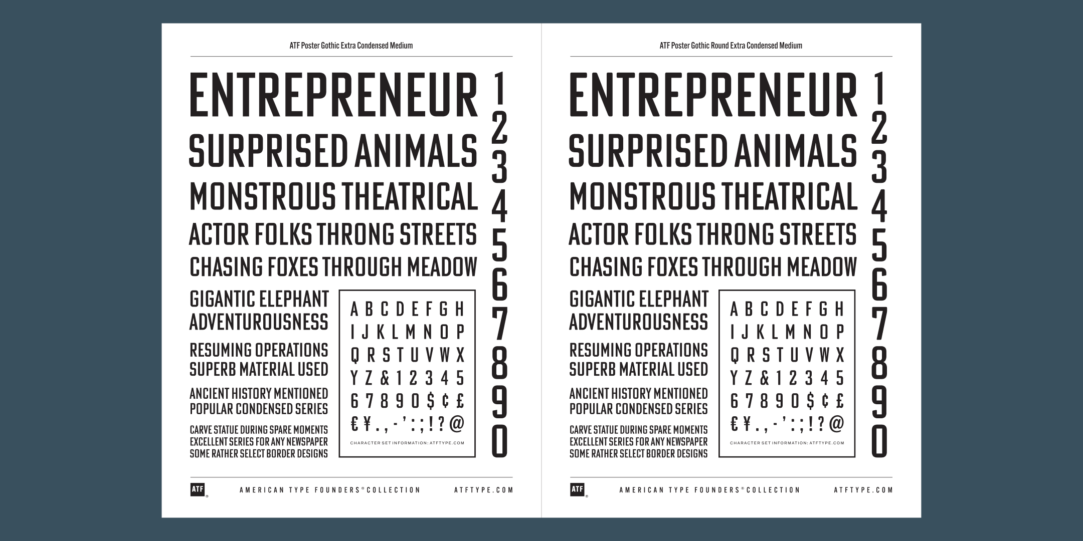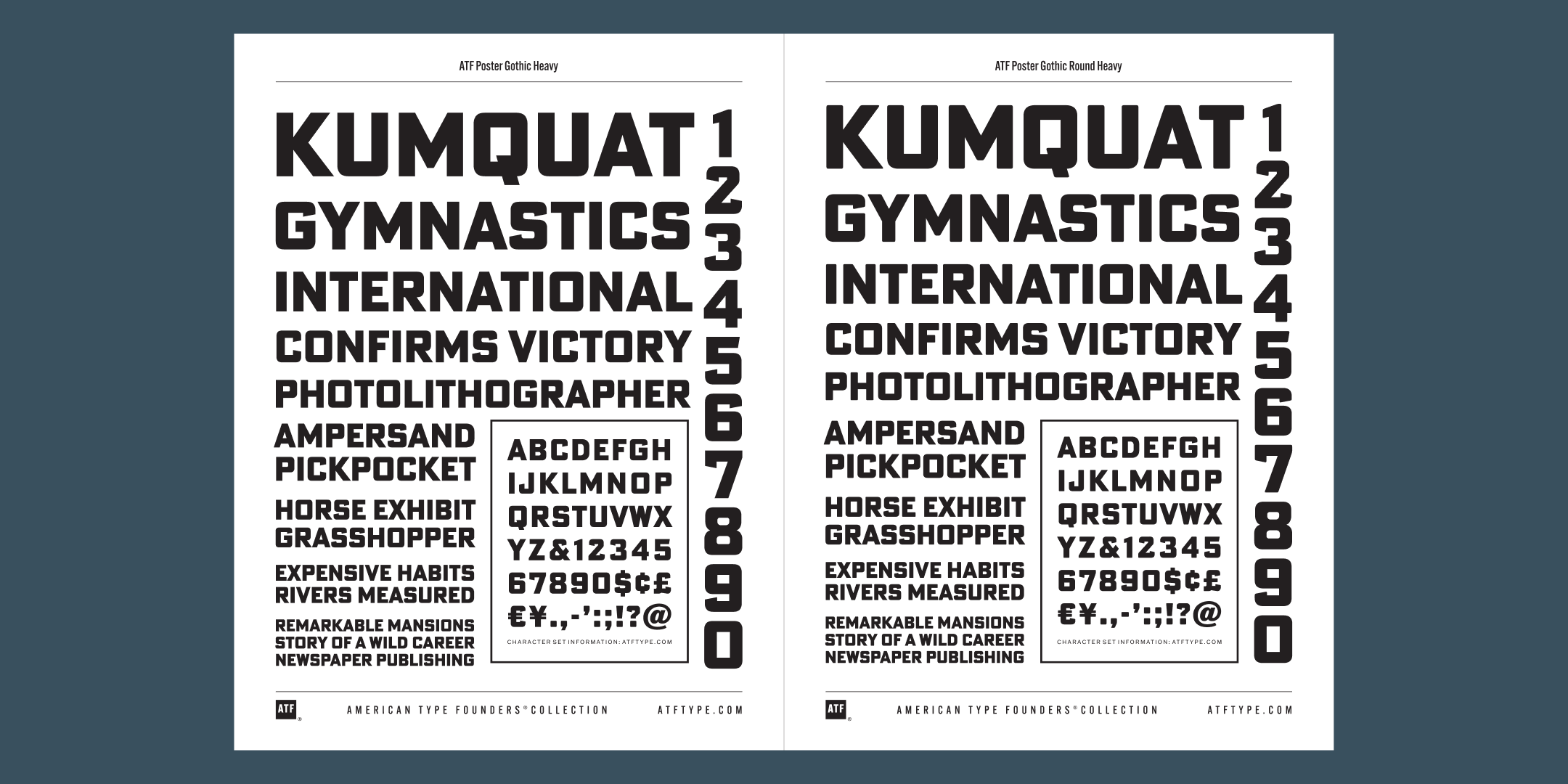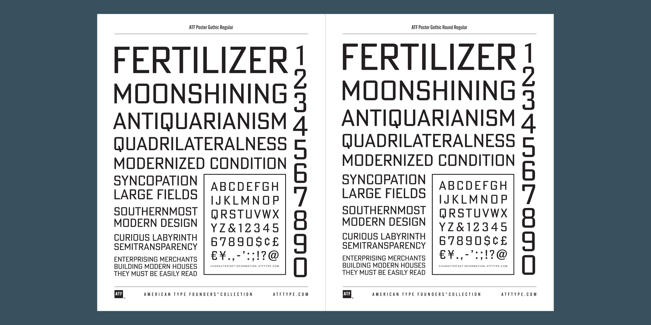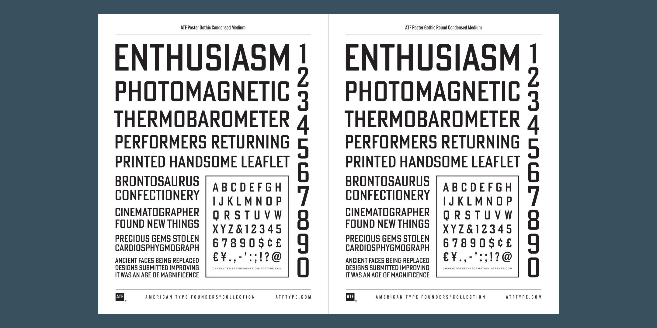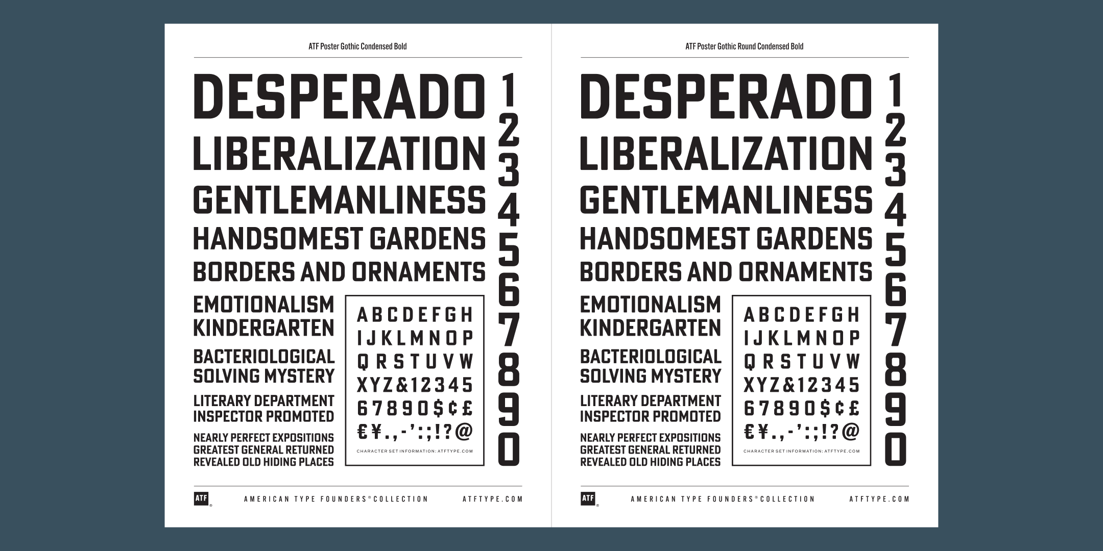 Certain weights also recall the style of lettering used on athletic team jerseys, television crime dramas, action & adventure movie titles, and engraved stationery. With three widths and five weights, ATF Poster Gothic is both distinctive and versatile. The complete family is also available in a “Round” version, with corners subtly rounded for a softer, more “printed” feel.
