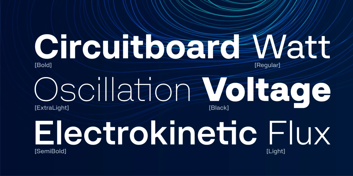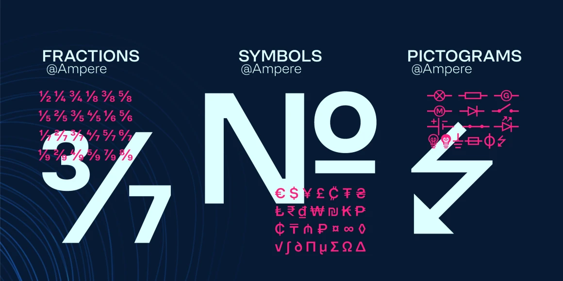 Ampere is sleek geometry with uncompromising clarity, its grid-like precision reflecting a modern design ethos. Crisp at small sizes and commanding at large, it suits immersive reading and bold headings alike. Squared ink traps soften sharp angles for a smooth finish, while special “electric” characters and ligatures add energy, harmony, and personality. With six weights from ExtraLight to Black, Ampere offers versatility, sophistication, and a subtle spark to any project.