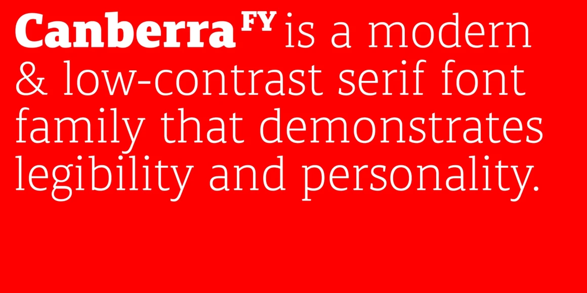 Canberra FY is a contemporary low-contrast serif family combining legibility with personality. Asymmetric, short serifs give it a versatile and friendly look, while rounded alternates for letters like a, e, g, v, w, and y allow more casual settings. Highly usable in book style at small sizes, its bold and black weights work well for headings, making it suitable for editorial use and hierarchical typography. With six weights and matching italics, it is also offered as a variable font.