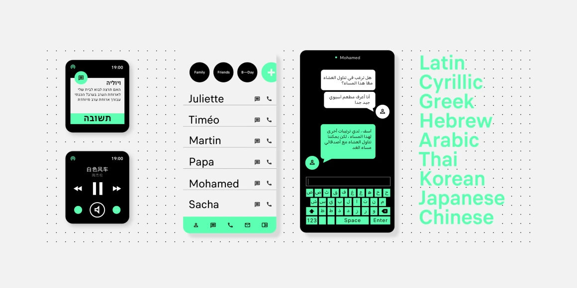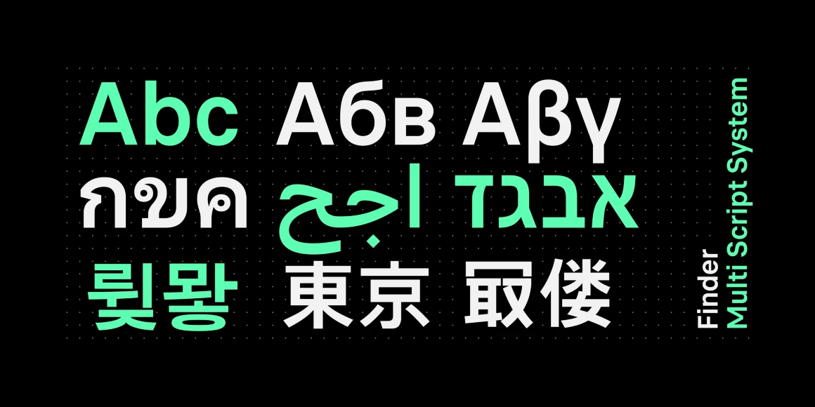 Finder is a versatile sans serif crafted for multi-script user interfaces. Its open forms, large counters, and generous spacing enhance legibility for designers in need of clarity at small sizes and are vital for dense screens and navigation. Supporting Arabic, Cyrillic, Greek, Hebrew, Latin, Simplified Chinese, Japanese, Korean, and Thai, Finder ensures a seamless global experience. Neutral and adaptable, it provides a cohesive typographic voice for UI, branding, and digital platforms worldwide.
