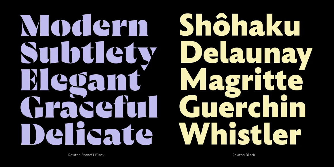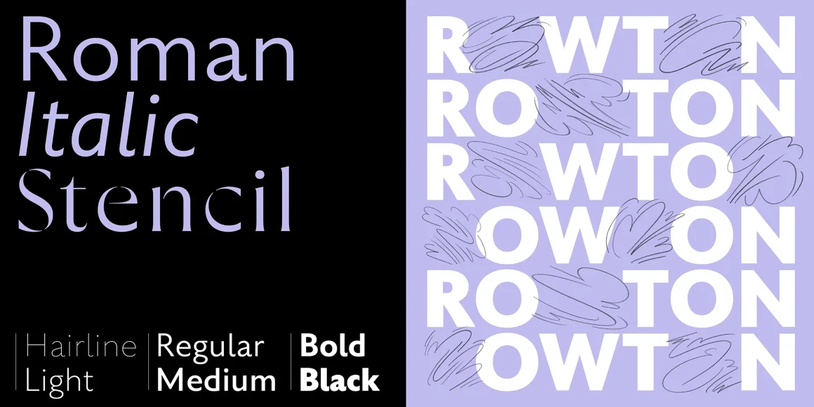 Rowton explores Humanist type design through three categories: upright sans, italic sans, and seriffed stencil weights. Collecting these diverse forms in one family highlights how seamlessly they mix within layouts. Inspired by Eric Gill, Rowton builds on his typeface while preserving its lively expressiveness, offering versatility for editorial, branding, and more. Each style of Rowton has six weights from Hairline to Black, plus matching italics, or as two variable fonts.