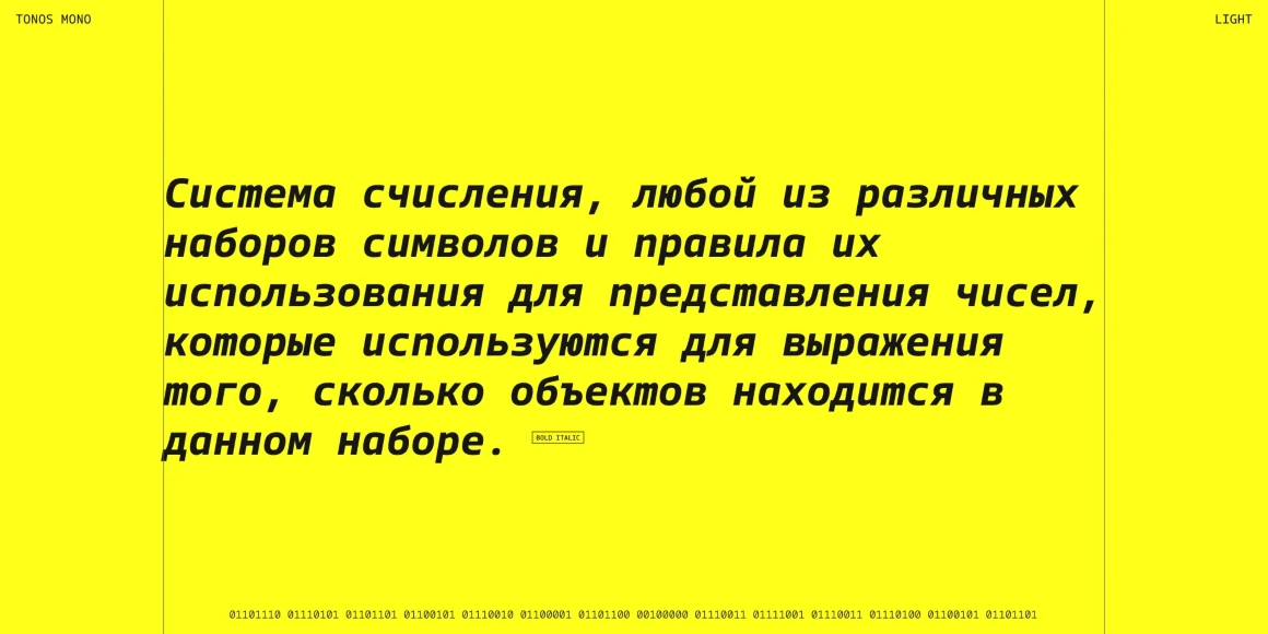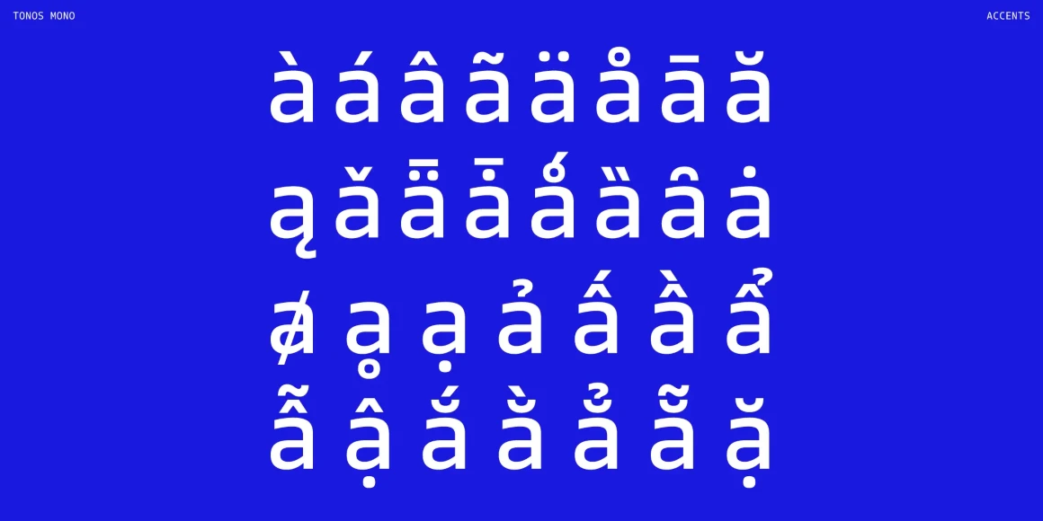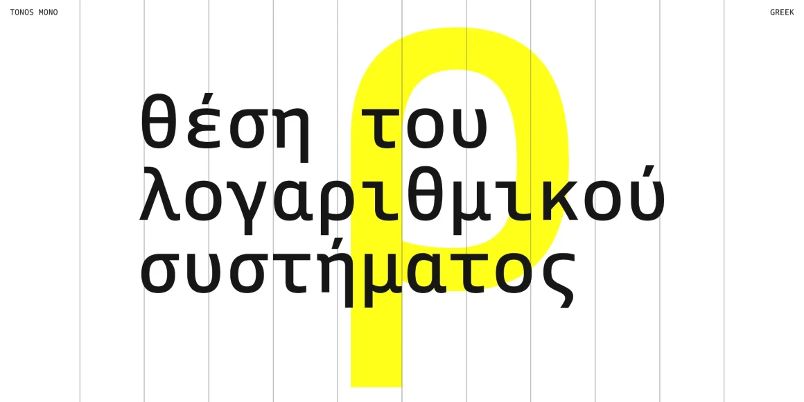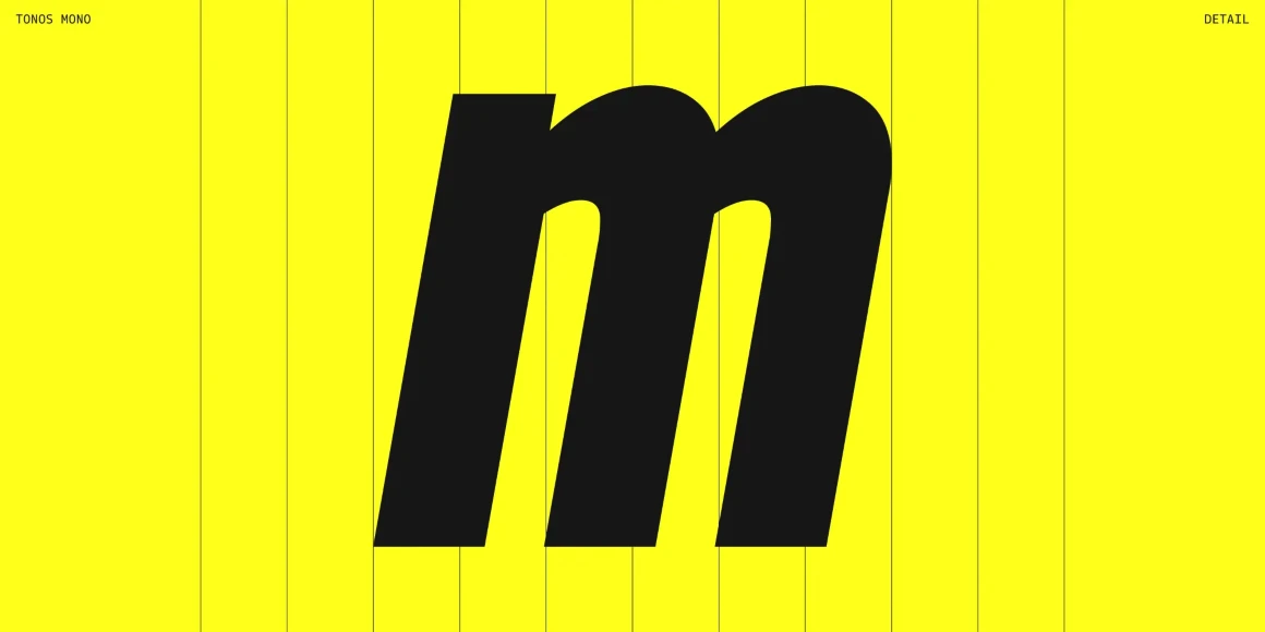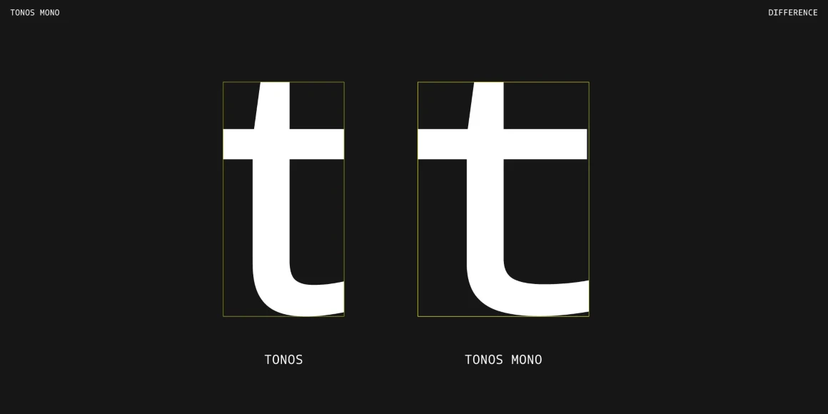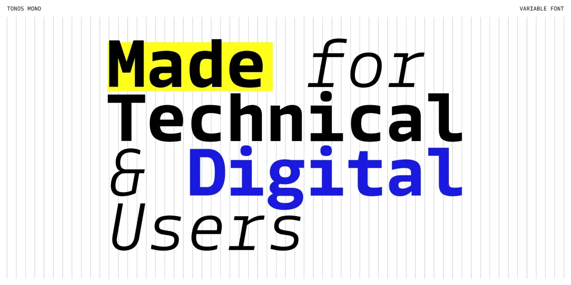 Tonos Mono is the monospace counterpart of Tonos, designed for UI and HMI contexts and supporting Latin, Cyrillic, and Greek. Its glyph design has calligraphic roots, giving it a warm, humanistic quality carried across all scripts for harmony and legibility. Available in weights from Light to Bold with true italics, it is both sturdy and engaging. Developed over years, Tonos Mono combines functionality, style, and language support, making it an excellent choice for modern interface typography.