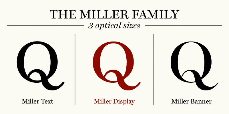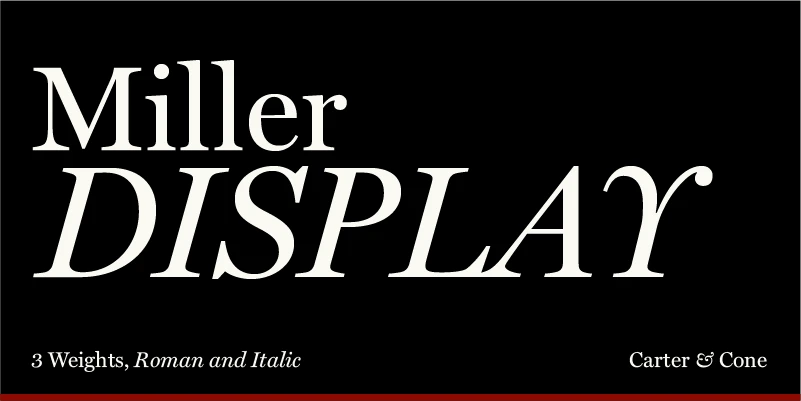 From fashion to finance and brands to books, Matthew Carter designed Miller Display with sharpened serifs and enhanced contrast to lend particular polish to headlines, decks, and pull quotes in need of something special to jump off the page or screen. The Miller family of typefaces is a seminal reinvigoration of the 19th-century Scotch Roman. This series was a team effort, with Richard Lipton, Jill Pichotta, Tobias Frere-Jones, and Cyrus Highsmith contributing at different stages.