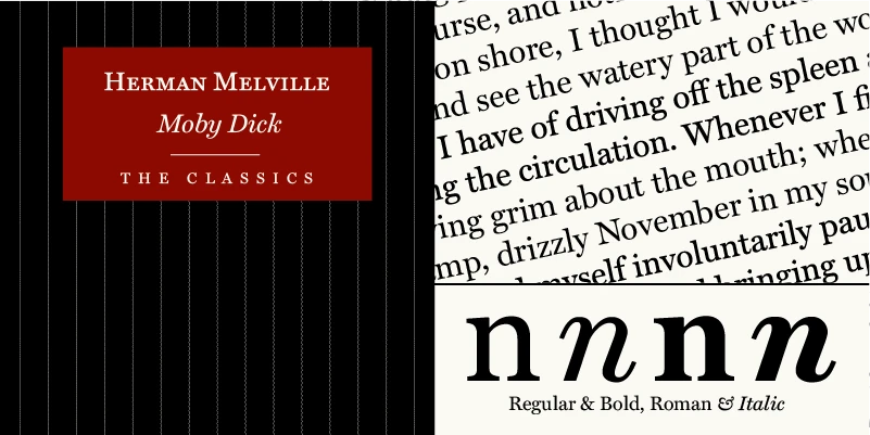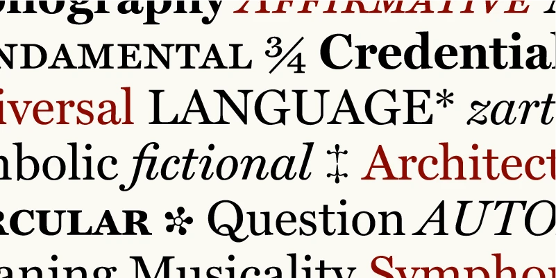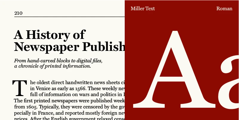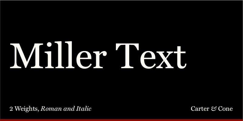 Miller Text, designed by Matthew Carter, epitomizes a reliable and attractive text font. Its utility and grace are apparent onscreen or in an off-the-rack fashion magazine. The Miller family of typefaces is a reinvigoration of the 19th-century Scotch Roman. This series was a team effort, with Richard Lipton, Jill Pichotta, Tobias Frere-Jones, and Cyrus Highsmith contributing at different stages. Carter & Cone’s Miller Text is available in Roman, Semi Bold, and Bold with companion Italics.