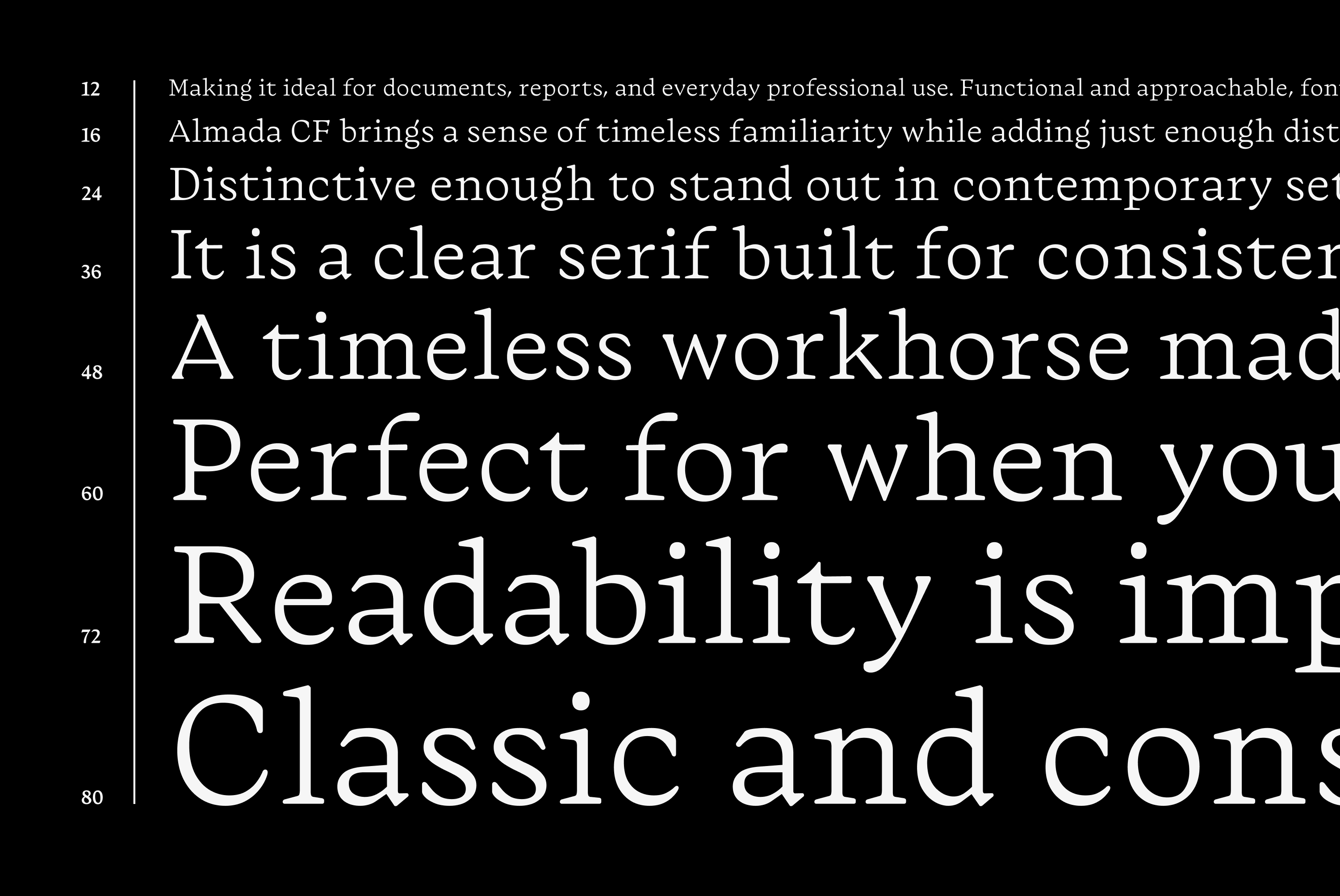 Almada CF is a dependable, text-focused serif font family. It’s a stylish, modern take on ubiquitous workhorse serifs found in offices around the 1970s. Carefully tuned spacing and long, purposeful serifs ground the text, providing stability for extended reading, while unexpected details create an engaging rhythm at display sizes. Supporting Cyrillic, Greek, and Latin scripts, and offered from Extra Light to Extra Bold with italics and variable fonts. Almada CF is ready to work!
