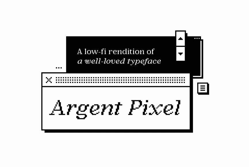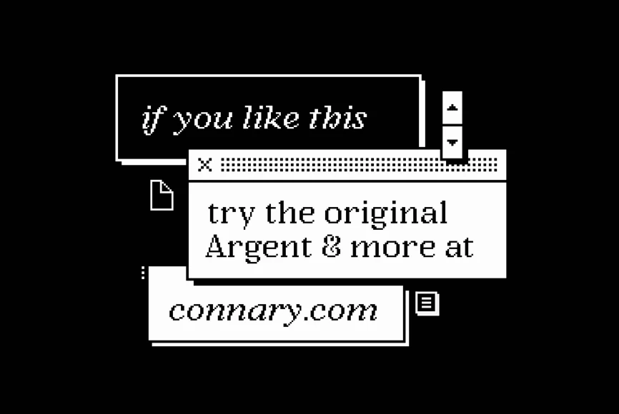 Argent Pixel CF is a playful bitmap version of the original dashing Argent typeface. With a pronounced x-height, this unexpectedly readable serif recreates the original font’s distinctive look in a style evocative of early Macintosh typography. It’s readily useful with its angled serifs and swashy italics for all kinds of typographic tasks needing a retro, low-resolution aesthetic, such as identities and brands, advertising, magazines and journals, book covers, packaging and labels, and more.