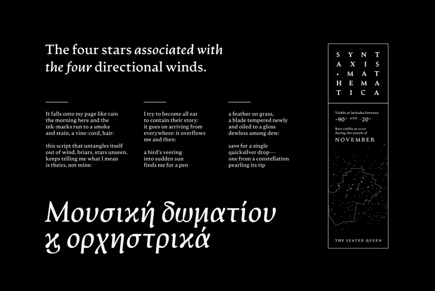 Artifex Hand CF is a humanist sans-serif variation on the original Artifex typeface; its serifs replaced with a subtle flare, lending a calligraphic feel and warm tone. Like its sibling, Artifex Hand is designed for flowing, easy-to-read text while doubling as a display font, thanks to its subtle details and moderate contrast.