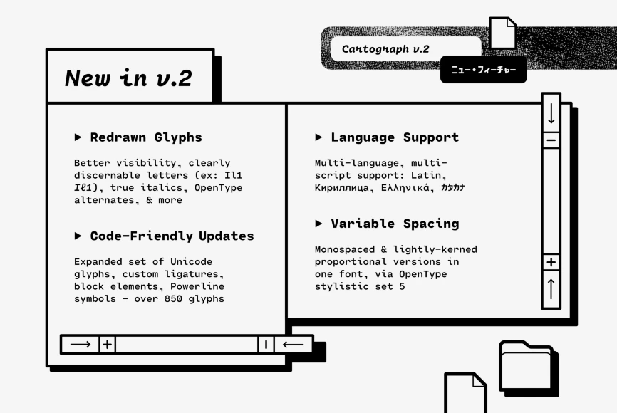 A monospaced typeface with character and warmth, Cartograph© CF is a handsome font family featuring a lush, cursive italic, code-friendly ligatures, and a proportional set accessible via OpenType. A tribute to the utilitarian beauty of terminals and typewriters, Cartograph excels in both code and prose.