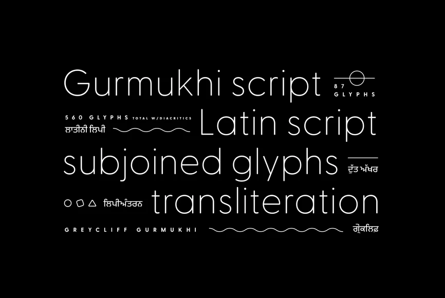 Rugged, hearty, and warm, the Greycliff CF series is a versatile font family. Covering both Gurmukhi and Latin scripts, Greycliff Gurmukhi CF allows for visually cohesive multiple-script applications in a beautiful geometric sans serif font family. Diacritics and subscript letters are included for Panjabi language support and compatibility. The geometric, near-monoline construction lends a classic durability, tempered by softened edges and vibrant shapes.