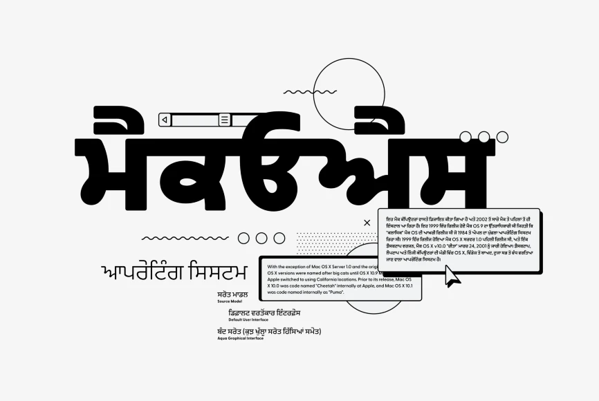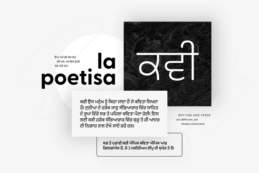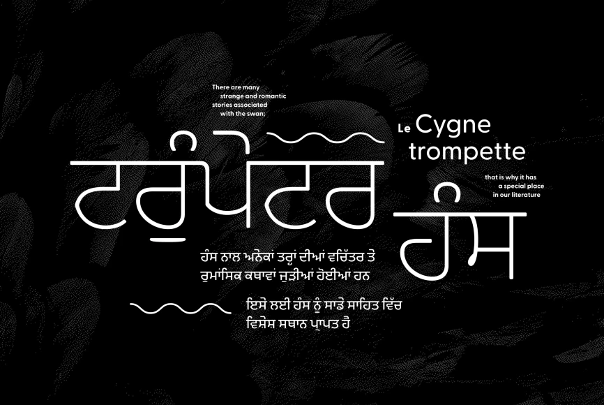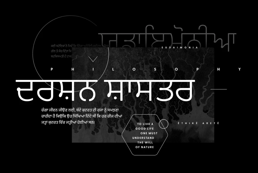 Rugged, hearty, and warm, the Greycliff CF series is a versatile font family. Covering both Gurmukhi and Latin scripts, Greycliff Gurmukhi CF allows for visually cohesive multiple-script applications in a beautiful geometric sans serif font family. Diacritics and subscript letters are included for Panjabi language support and compatibility. The geometric, near-monoline construction lends a classic durability, tempered by softened edges and vibrant shapes.