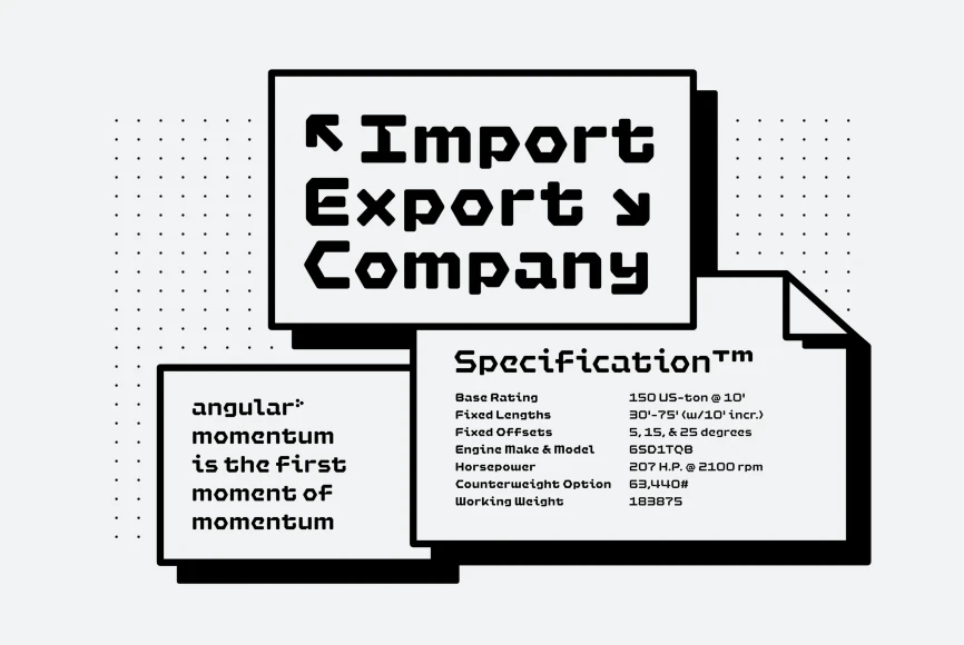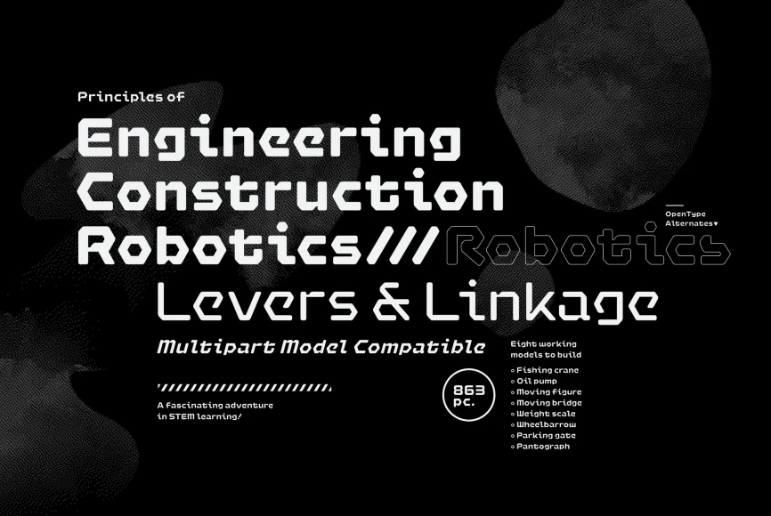 Hexaframe CF evokes the awe and potential of of heavy machinery and robotics. Clad in tough polygons and rounded edges, Hexaframe is a perfect typeface for corporate identity, STEM toys, and user interface design. All typefaces from Connary Fagen include free updates, including new features, and free technical support.