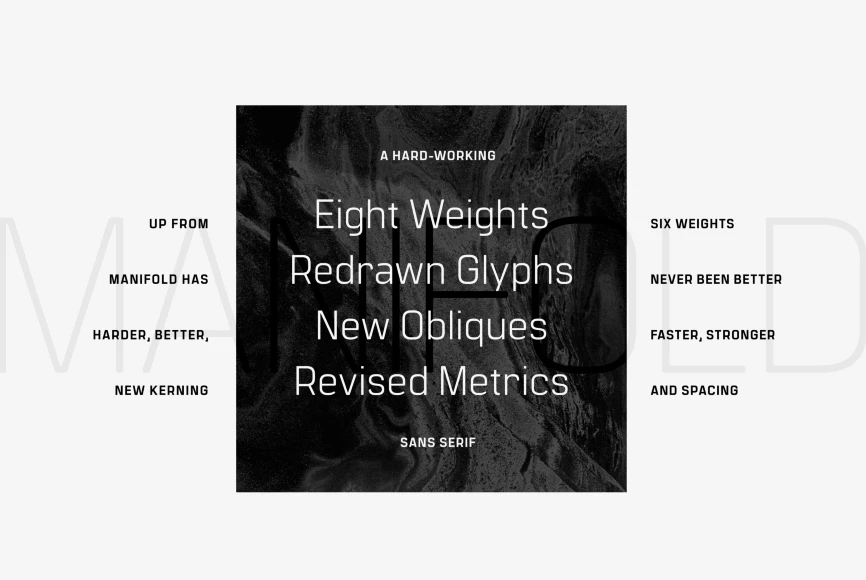 Manifold CF is a utilitarian sans serif that merges terminal-inspired precision with a warm, unified structure and a tall x-height. Ideal for interfaces, short copy, and — tracked out — cinematic titles and headlines. The Extended style pushes this engineering further, creating wide, confident forms suited for tech, sports, editorial, and bold branding. With eight weights, matching italics, and support for Latin, Cyrillic, and Vietnamese, it covers more than thirty languages.