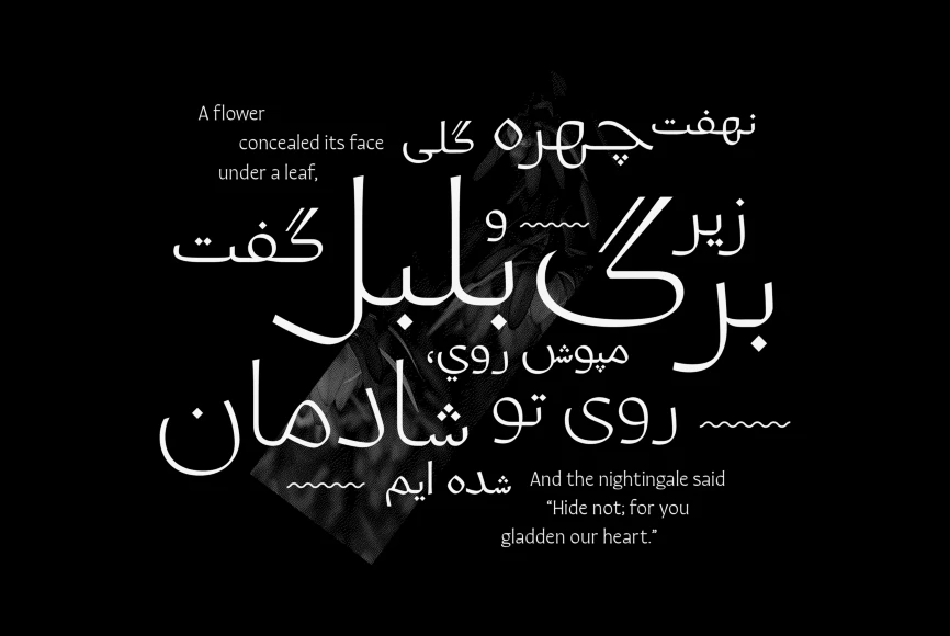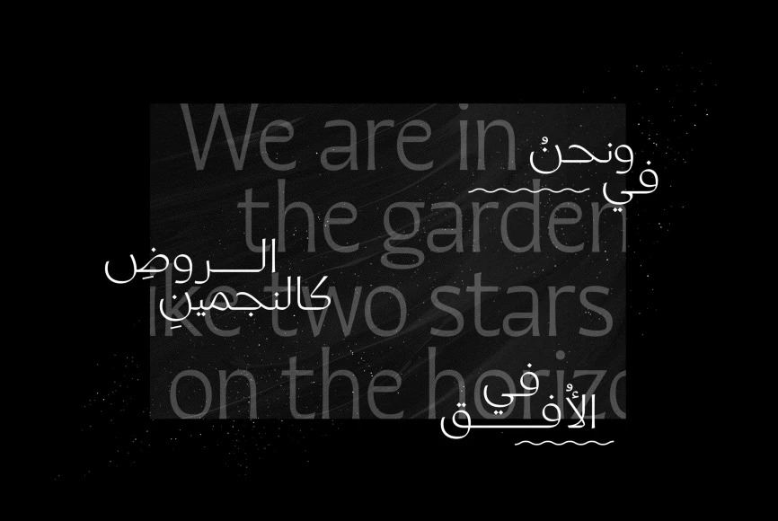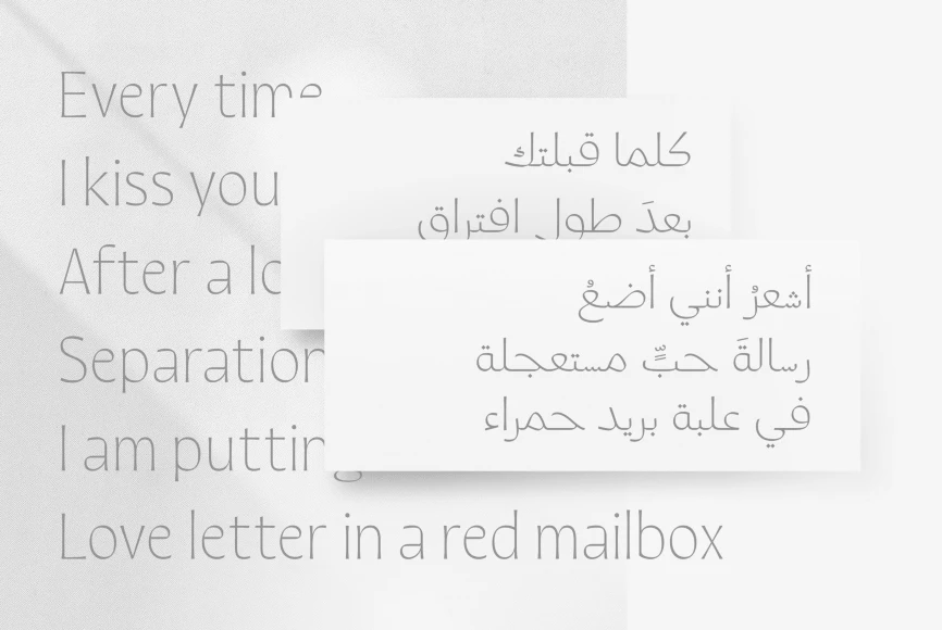 Quiverleaf Arabic CF brings the graceful flowing movement of the original humanist Quiverleaf to the Arabic script. The shapes appear ribbon-like, effortlessly gliding from letter to letter. Quiverleaf’s versatile design allows for beautiful text and airy headlines, making it an ideal choice for print packaging, global brands, and oversized posters. Five weights — delicate thin to a hearty extra bold — cover Latin and Arabic scripts in an expressively gorgeous and visually unified font family.