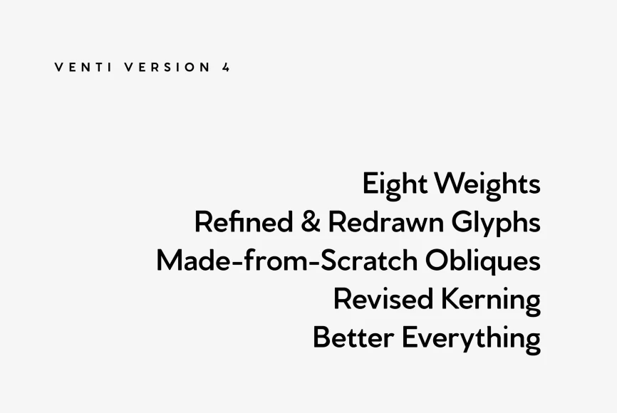 Venti is a geometric font family with a warm, engaging character. Inviting and versatile, Venti’s subtle human overtones are well suited to headlines, logos, and short text.