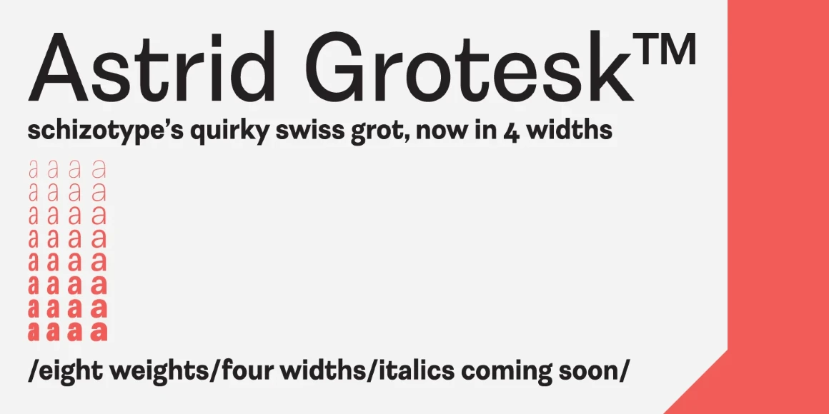 Astrid Grotesk is a neo-grotesk workhorse. It is a normalized version of Schizotype Grotesk. Normalized; not neutralized. Where many neo-grots appear cold with harsh neutrality, Astrid emanates a warmth from its clunkiness. Bored of those other Swiss-style typefaces? Astrid Grotesk could be the face you need to breathe new life into your designs. With 40 styles and coupled with the more eccentric Schizotype Grotesk, you’ve got an unorthodox branding system ready to use straight out of the box.